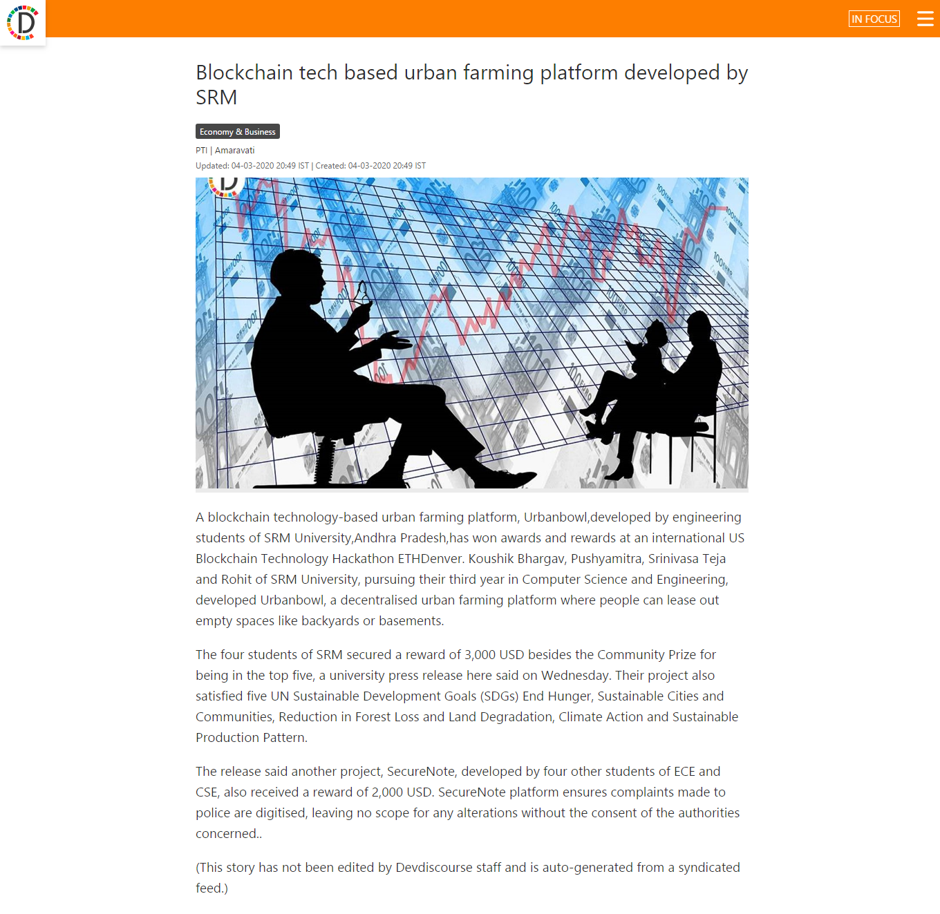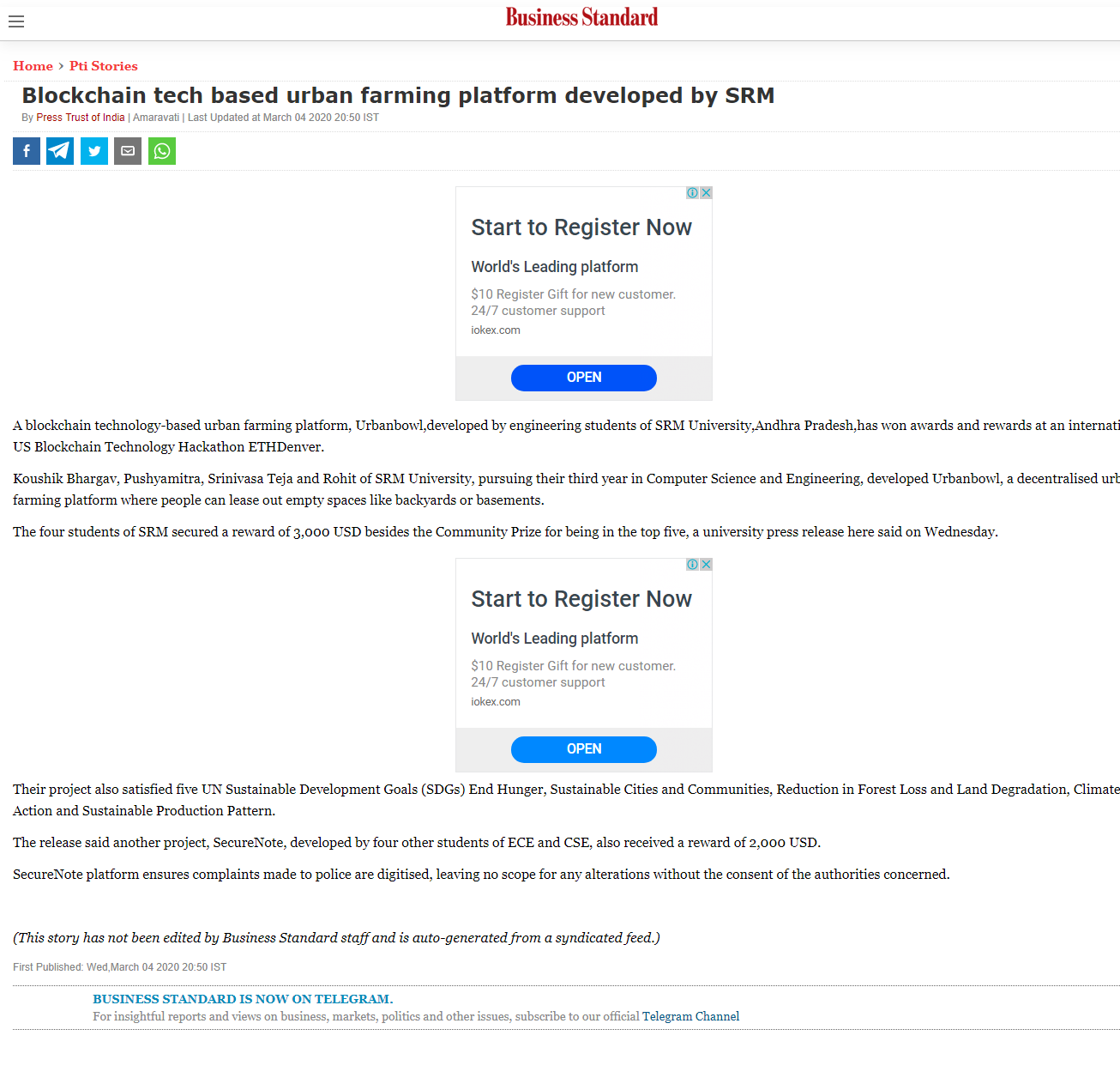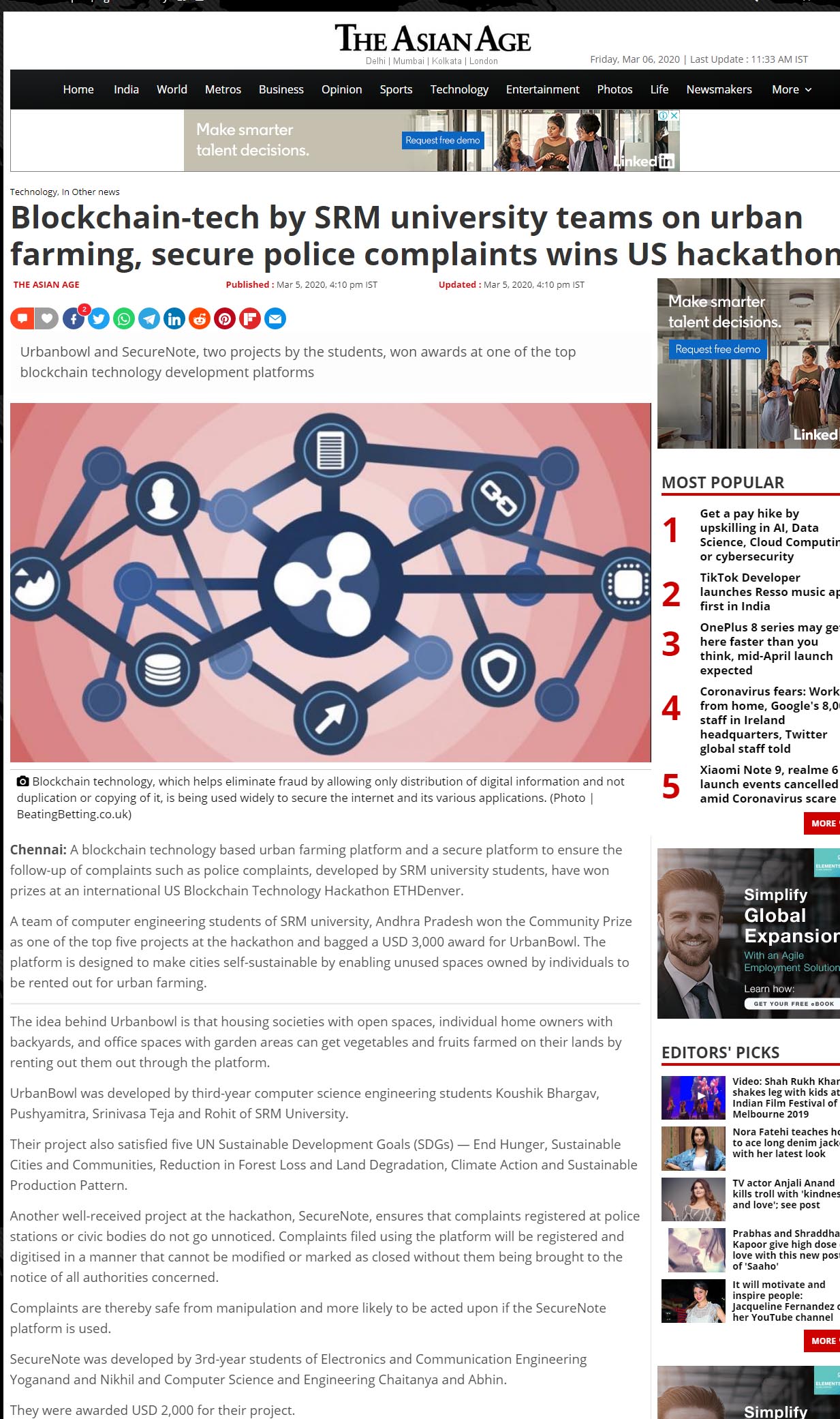 Blockchain tech based urban farming platform developed by srm