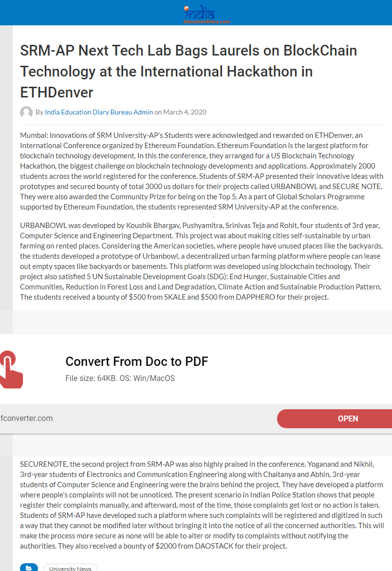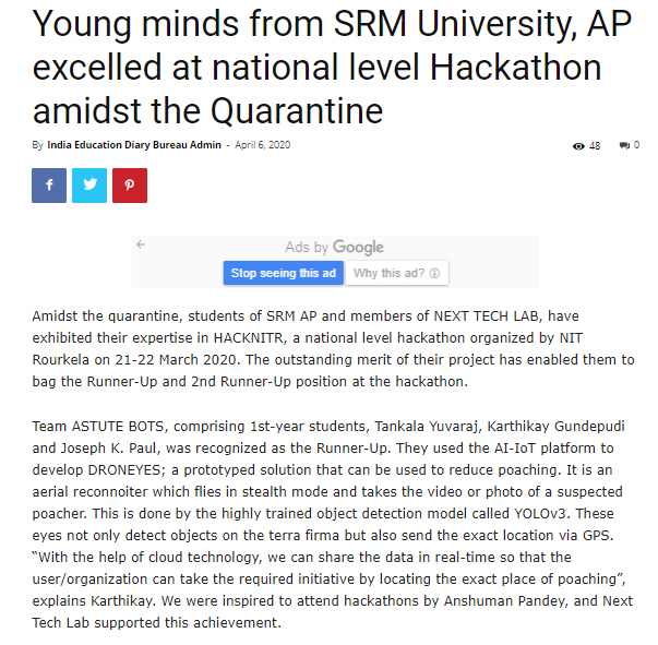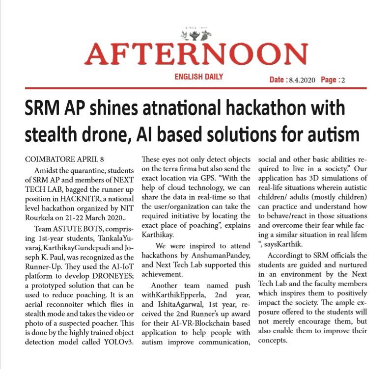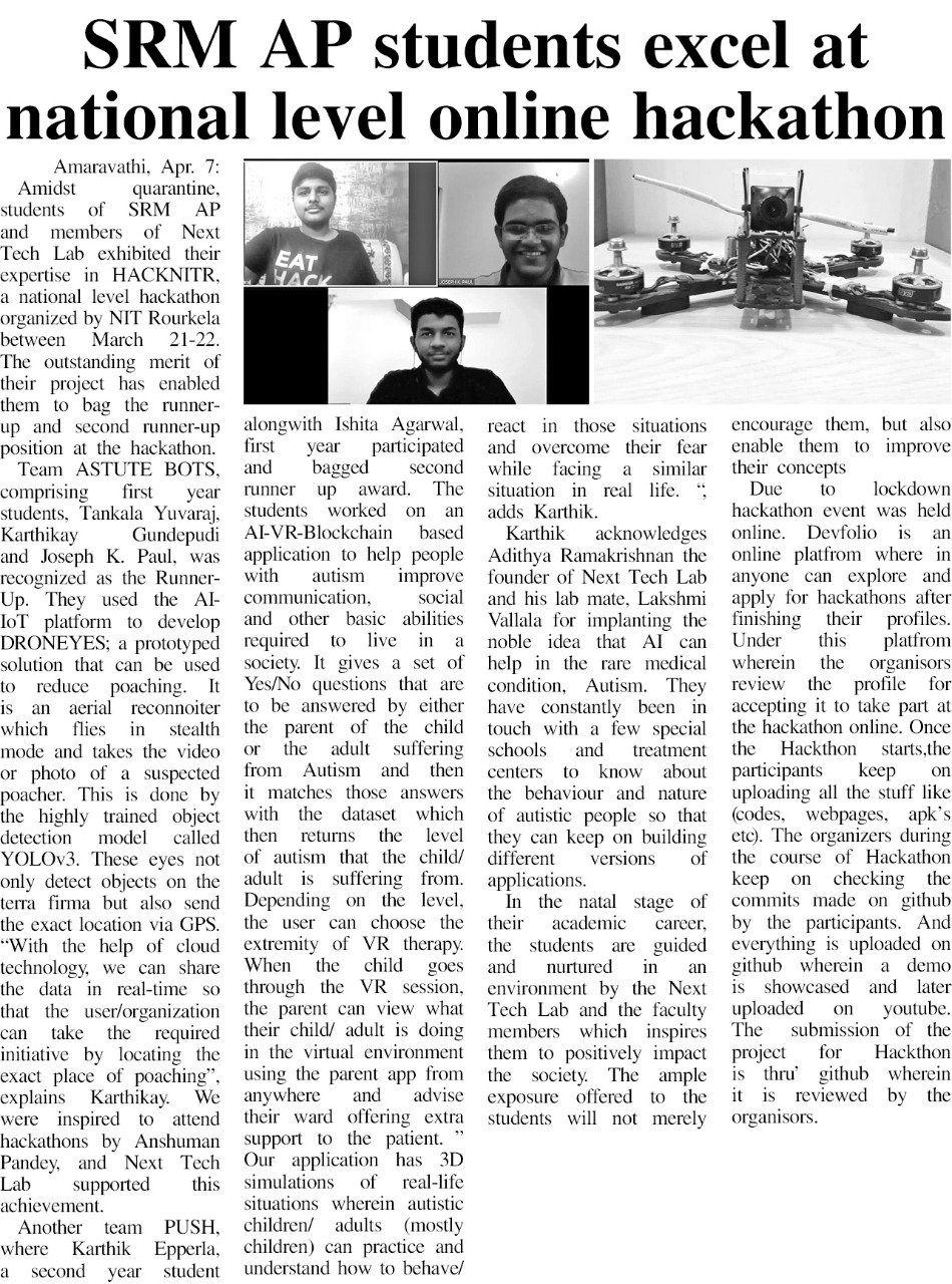 Young minds from SRM University, AP excelled at national level Hackathon amidst the Quarantine