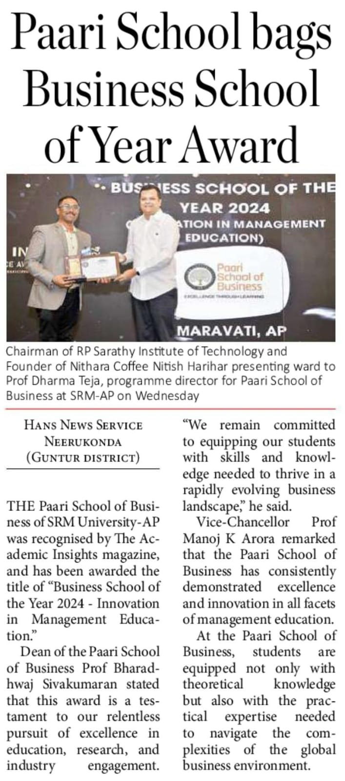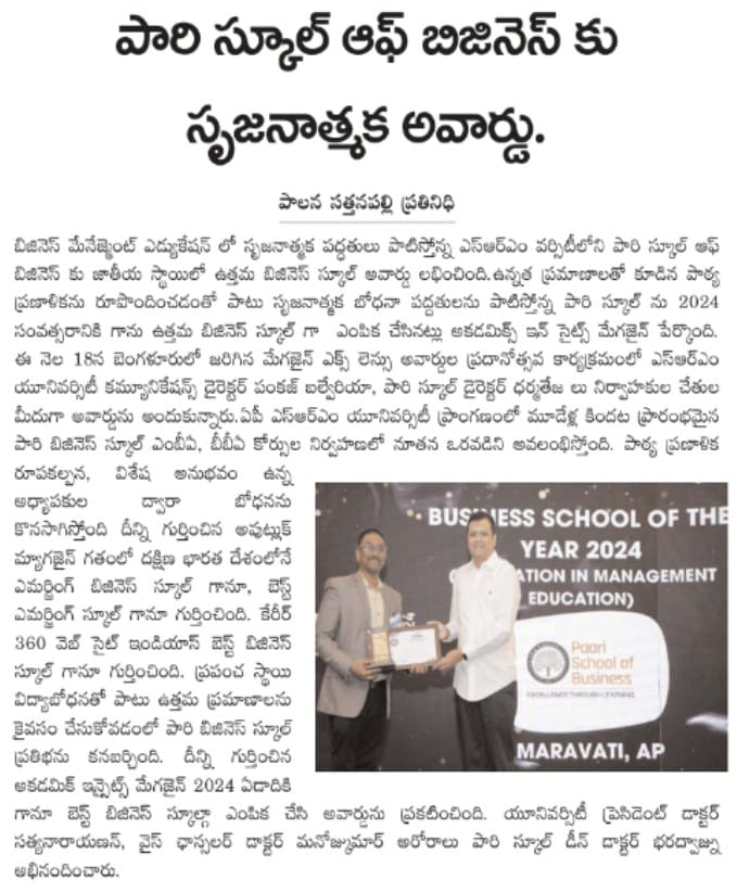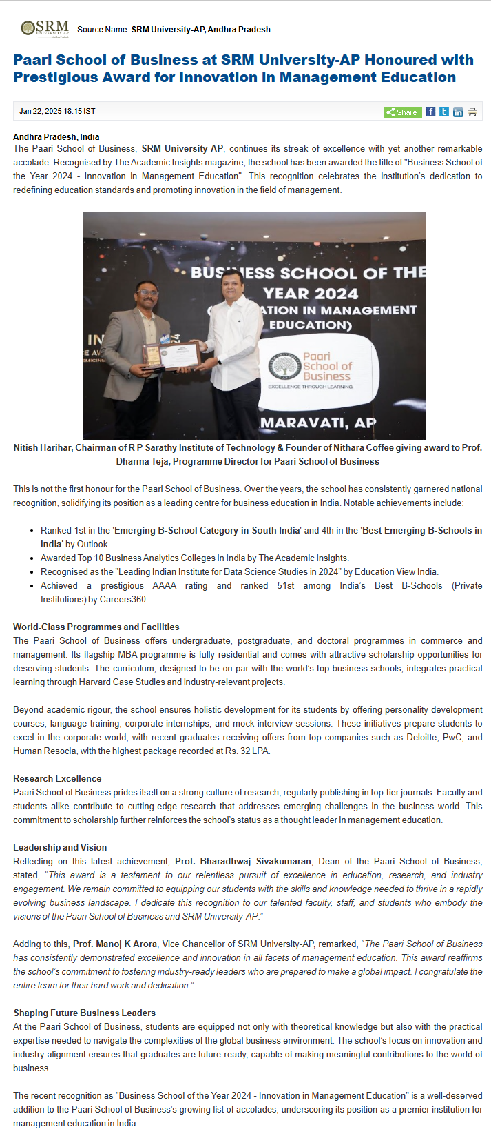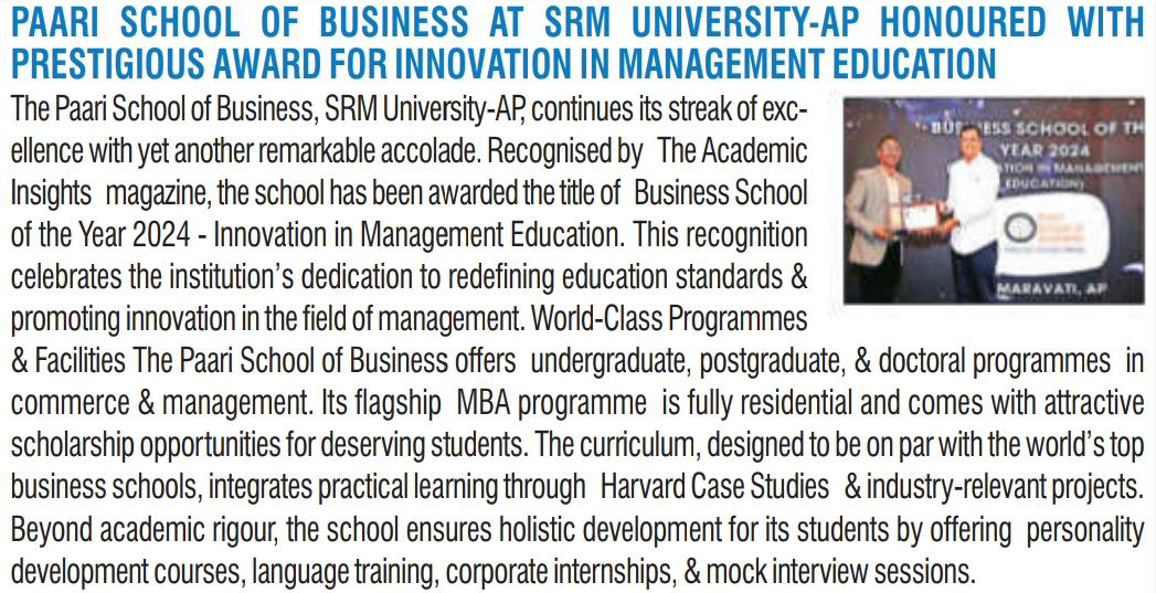 Paari School of Business at SRM University-AP Honoured with Prestigious Award for Innovation in Management Education