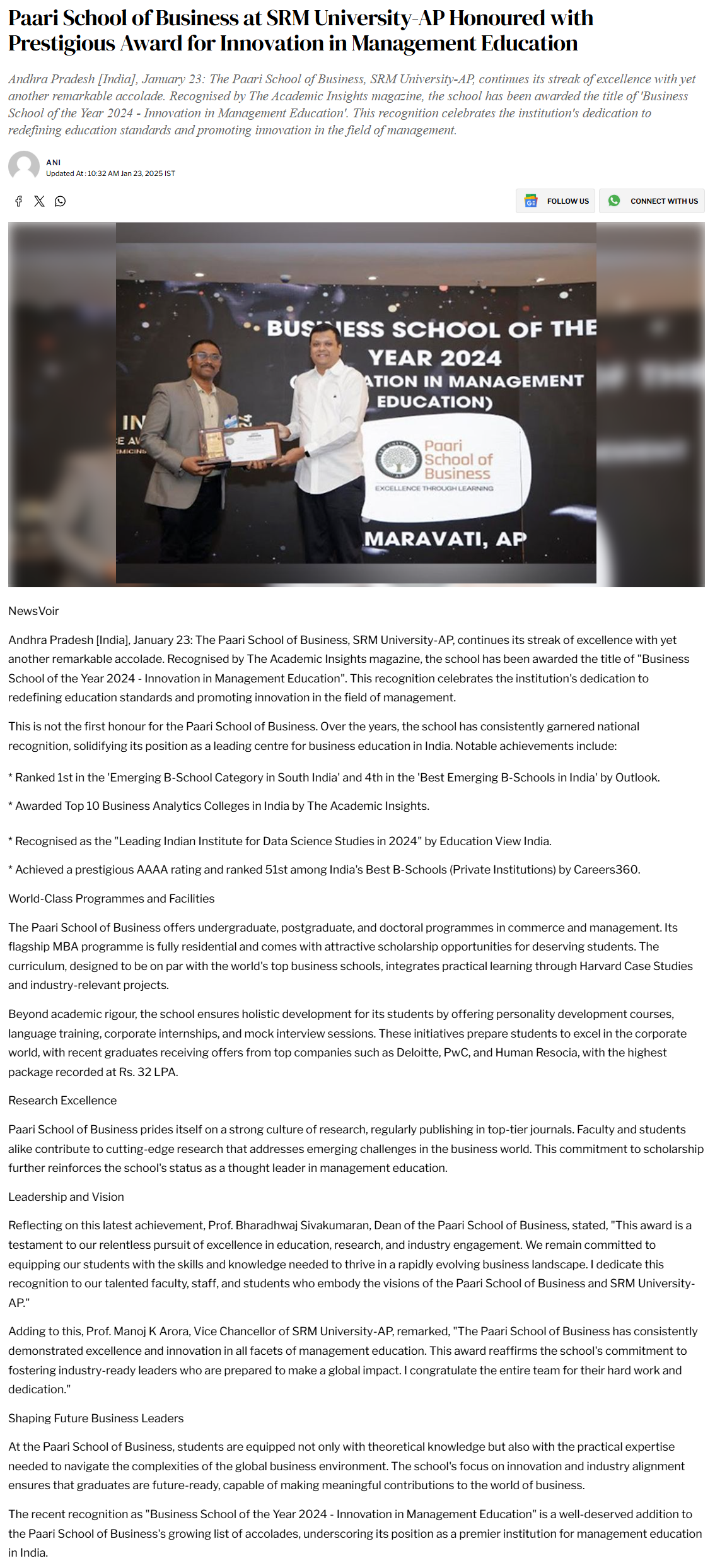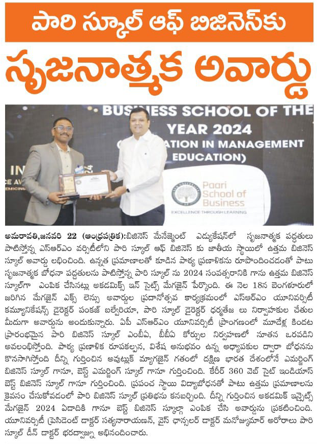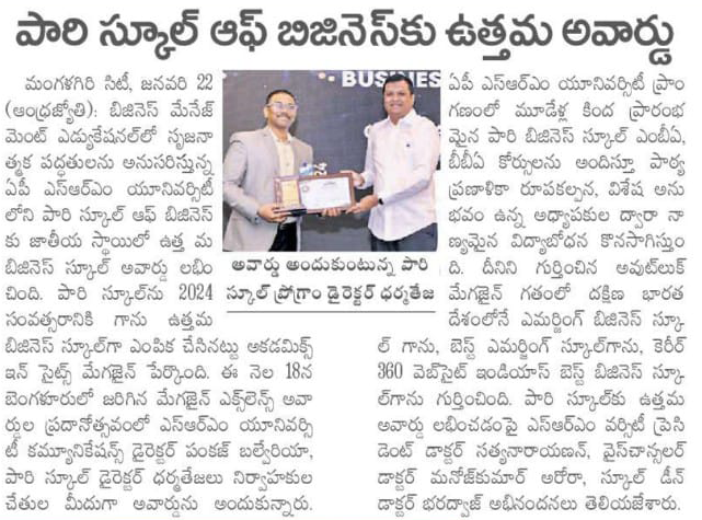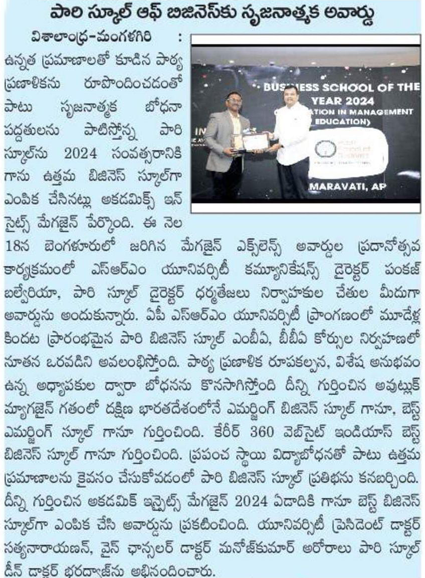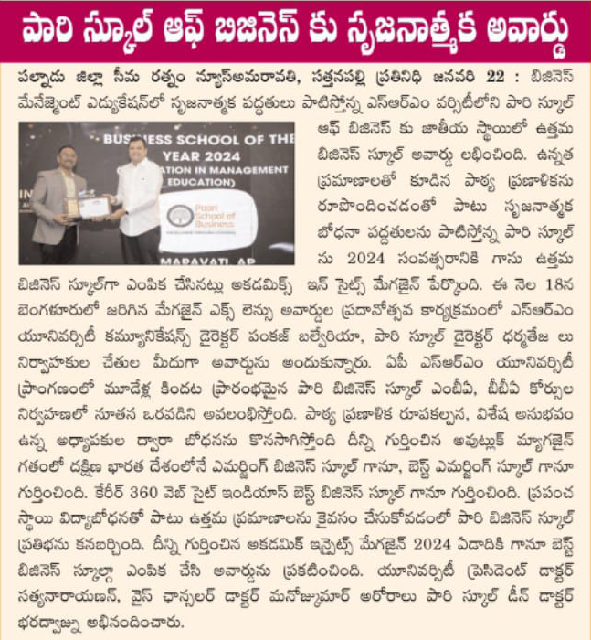 Paari School of Business at SRM University-AP Honoured with Prestigious Award for Innovation in Management Education