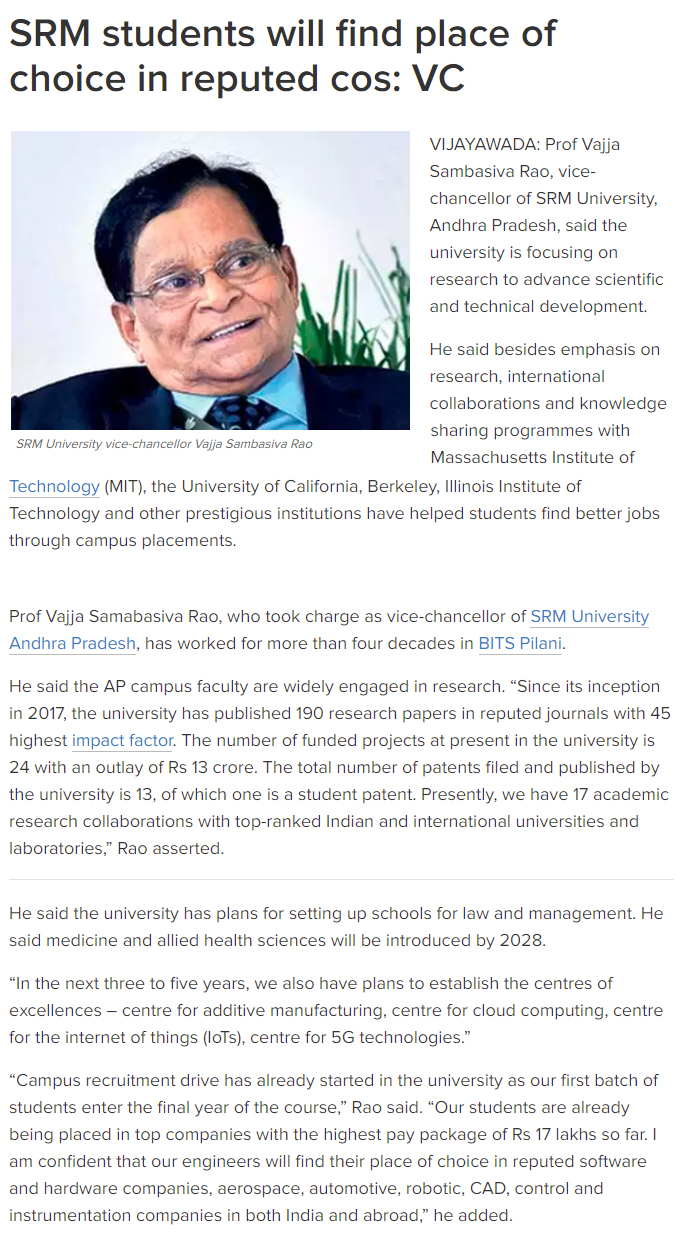 Prof Vajja Sambasiva Rao, Vice-Chancellor of SRM University-AP, Andhra Pradesh interacts with The Times of India