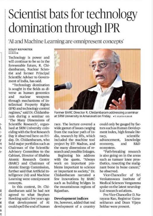 “Technology domination is sought in the fields as diverse as human genomics and nuclear weapons through mechanisms of Intellectual Property Rights (IPR) and technology control regimes,” said Dr. Chidambaram during a seminar on ‘The Many Dimensions of Scientific Research’, organised at SRM University coinciding with the first Research Day it observed here on Friday. Dr. Chidambaram, who held major portfolios such as Chairman of the Scientific Advisory Committee to the Cabinet, Director of Bhabha Atomic Research Centre (BARC) and Chairman of Atomic Energy Commission, further said that Artificial Intelligence (AI) and Machine Learning were omnipresent concepts.