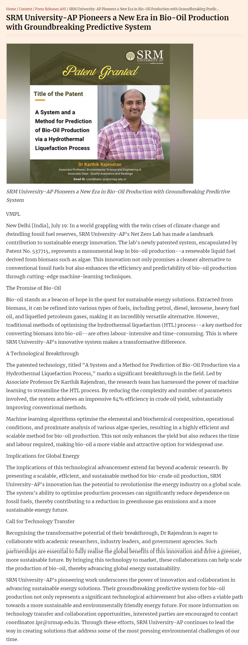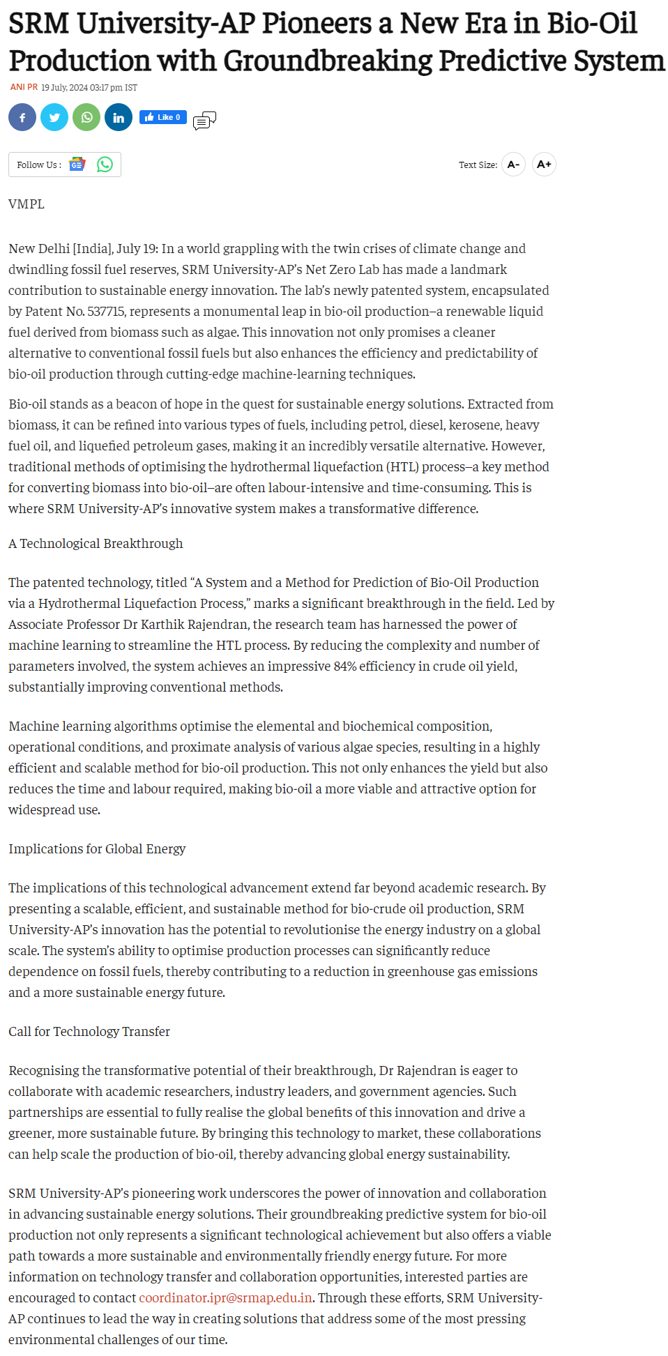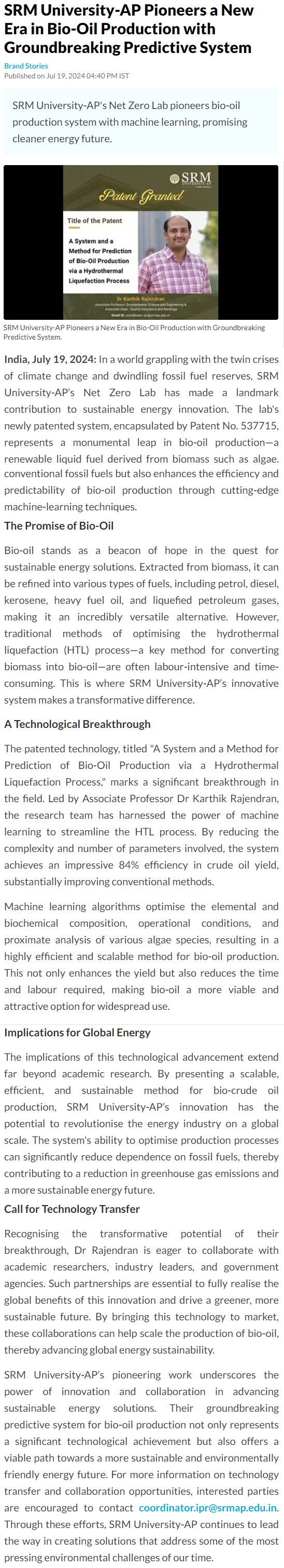 SRM University-AP Pioneers a New Era in Bio-Oil Production with Ground-Breaking Predictive System