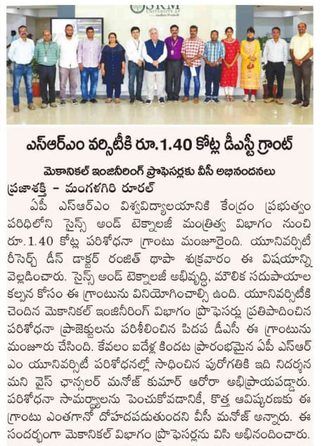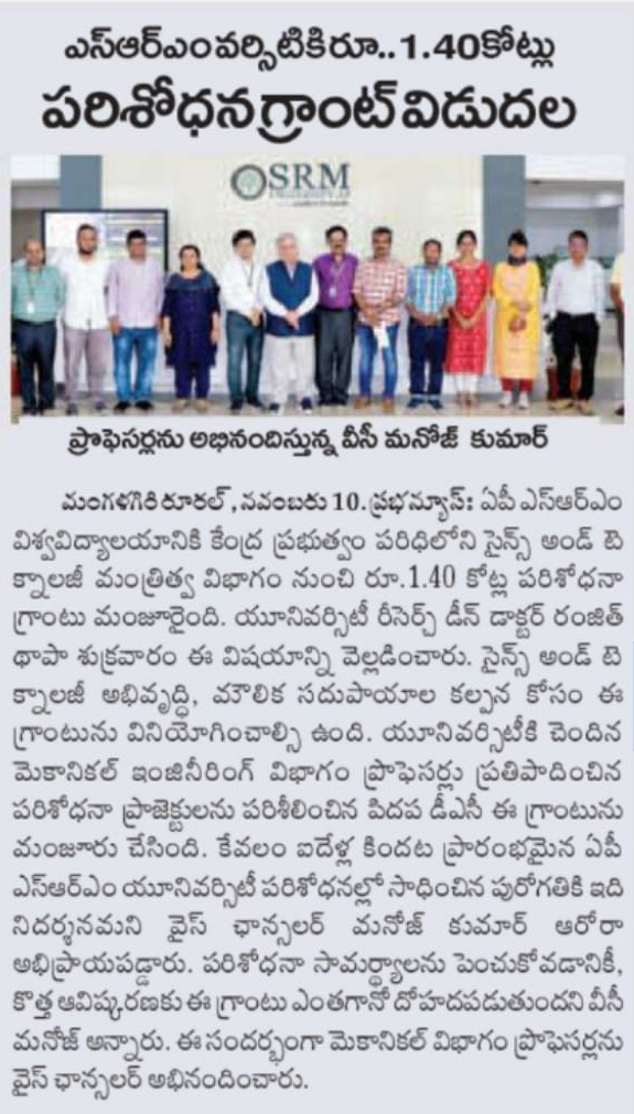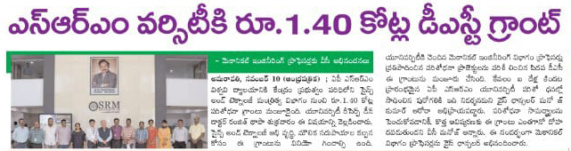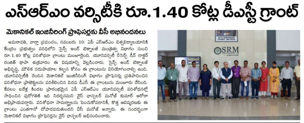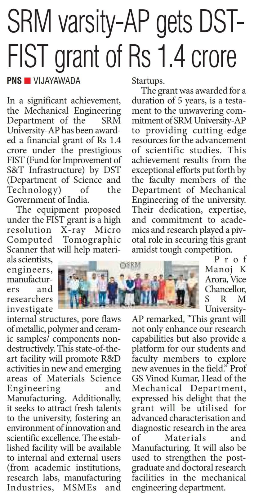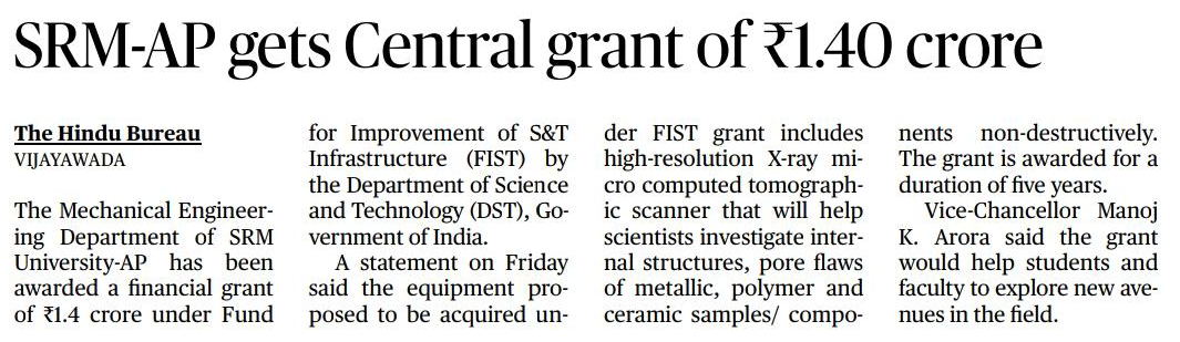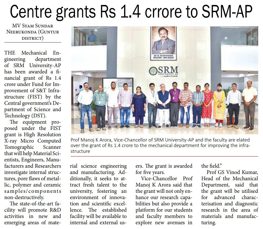 SRM University-AP Receives DST-FIST Grant of Rs 1.4 Crores for Mechanical Engineering Department