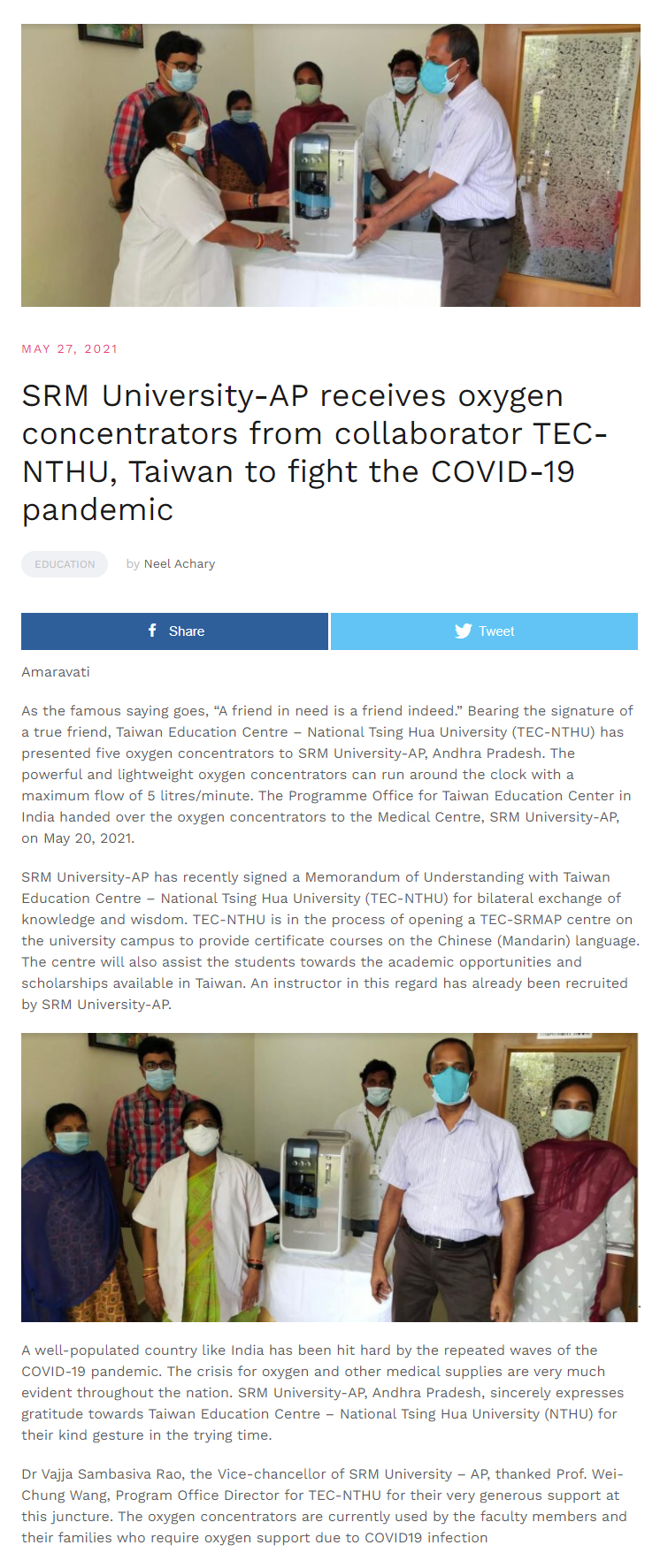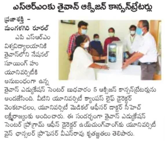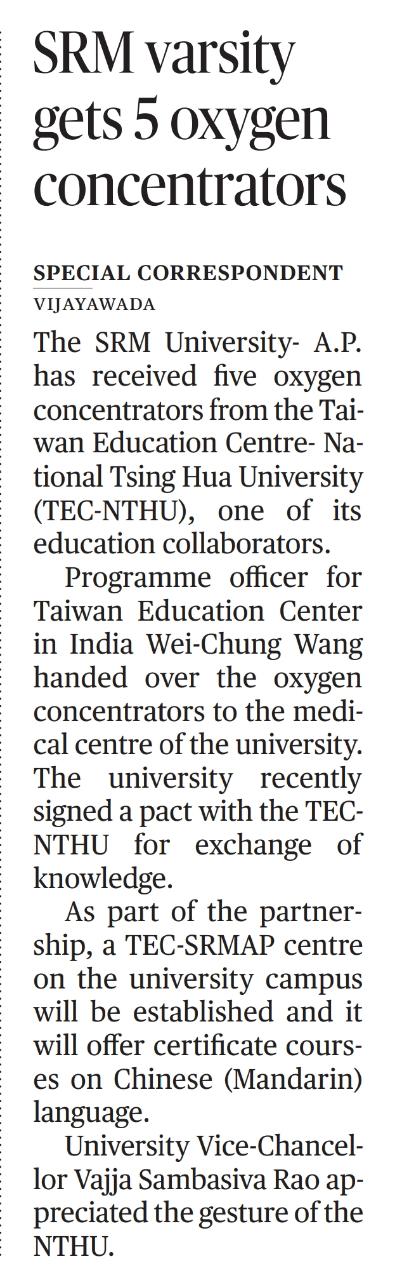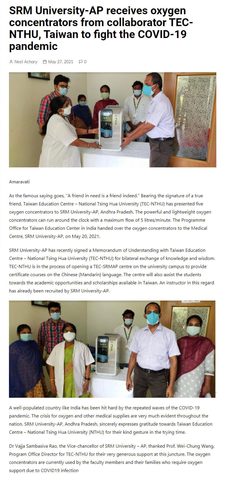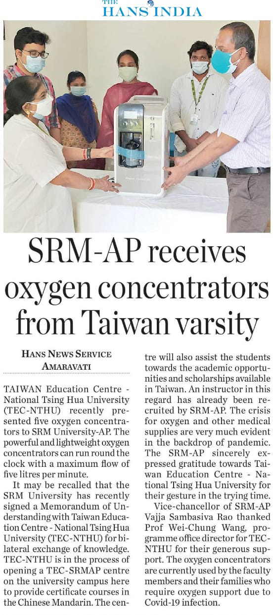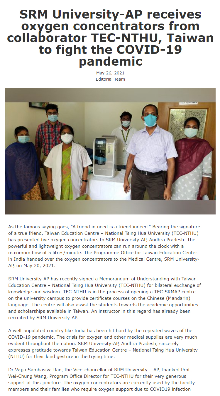 SRM University-AP receives oxygen concentrators from collaborator TEC-NTHU
