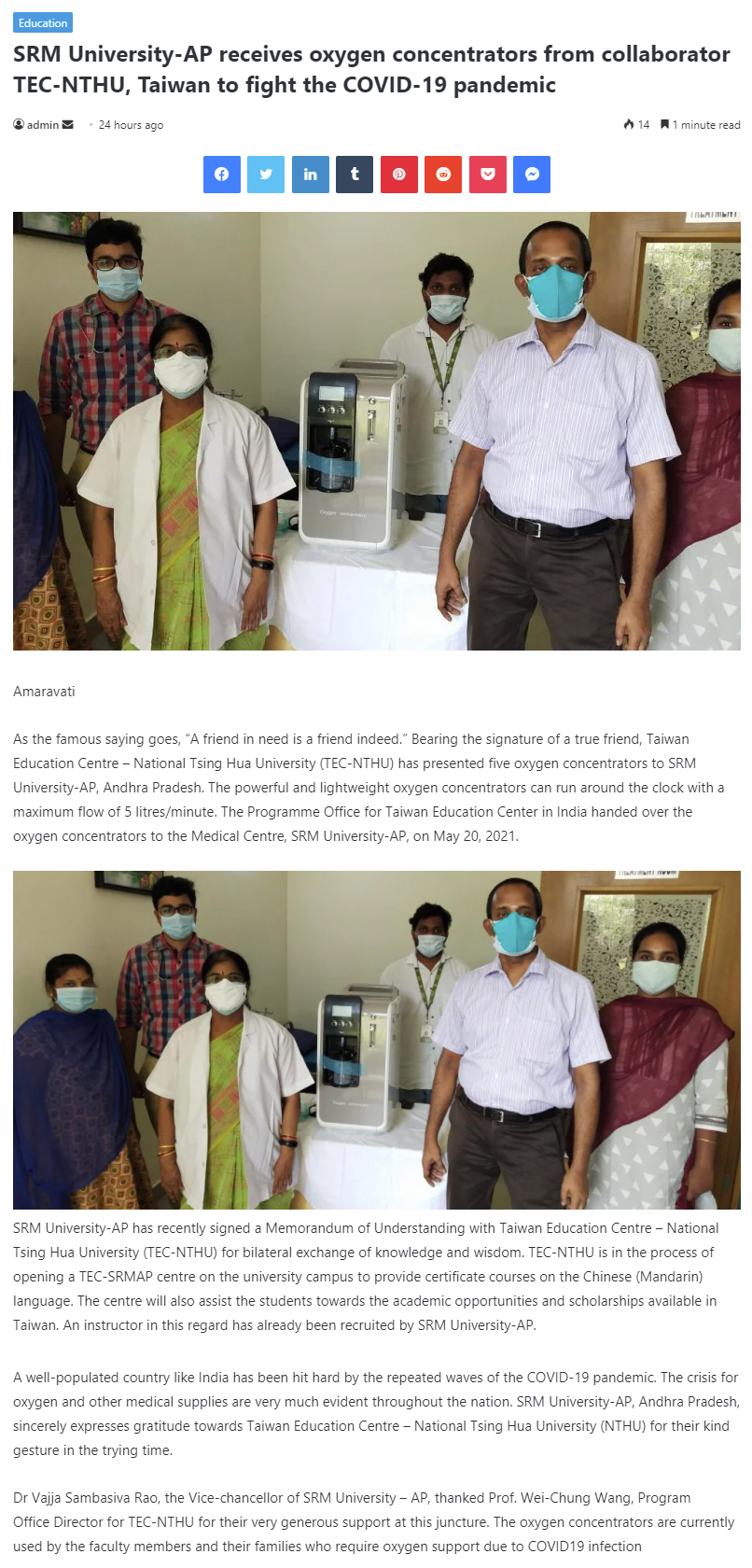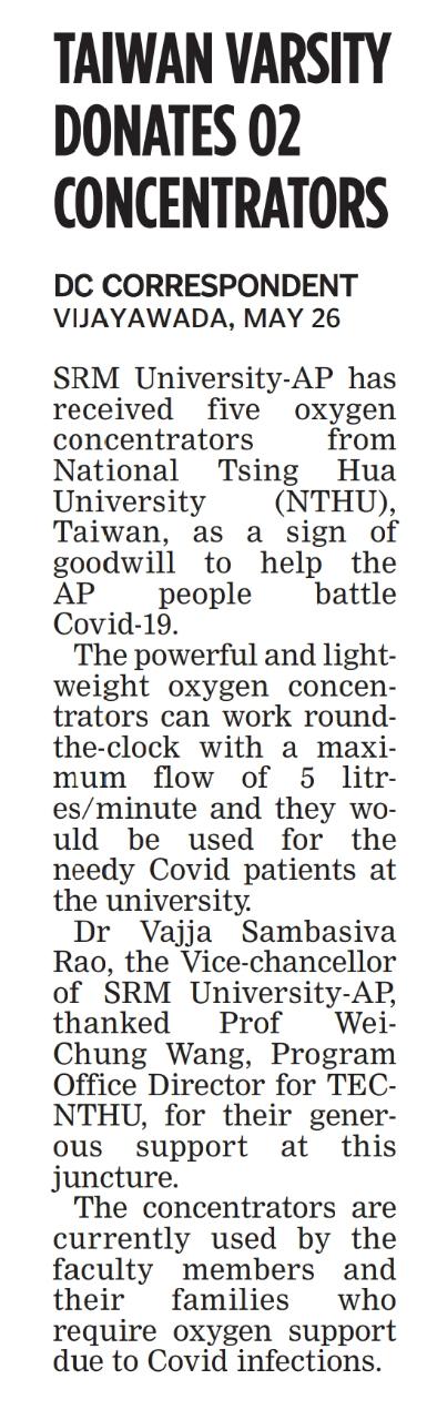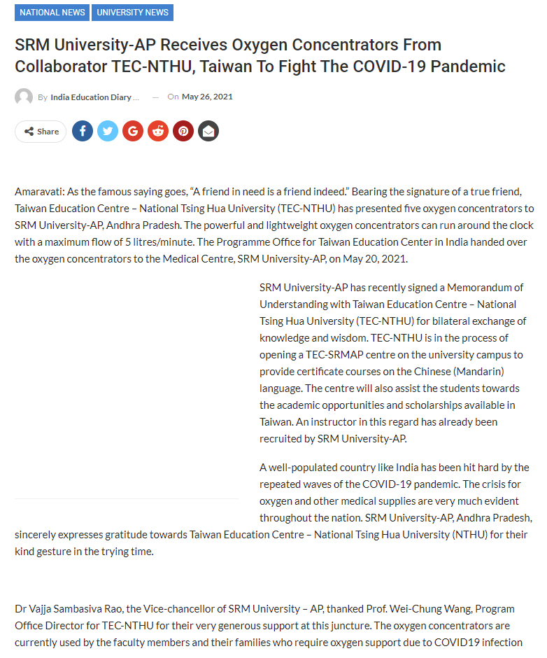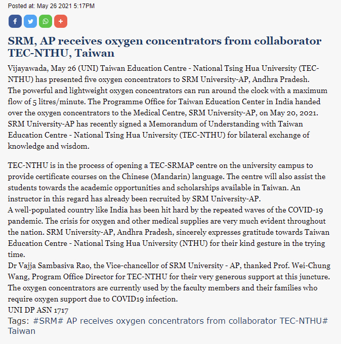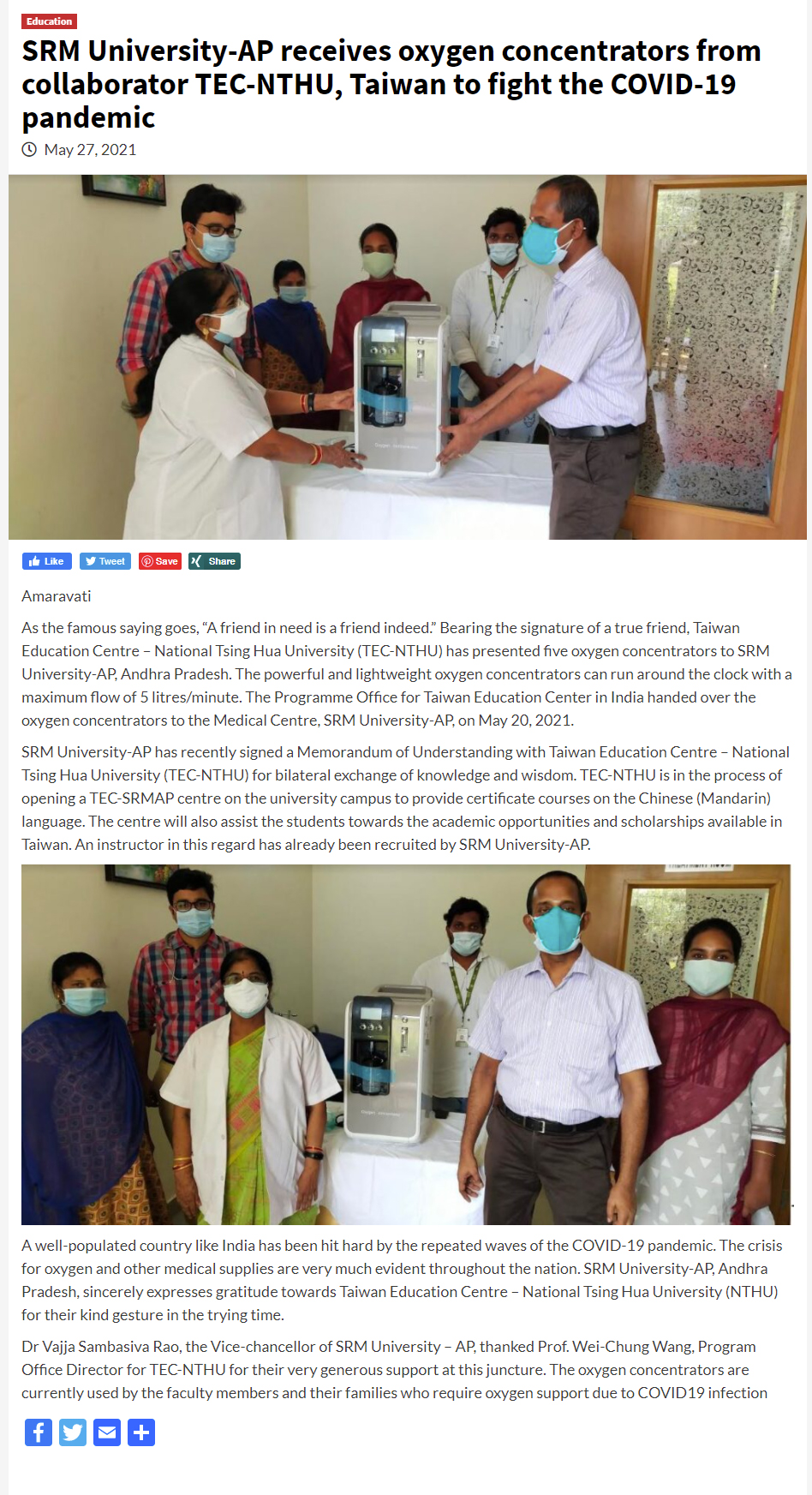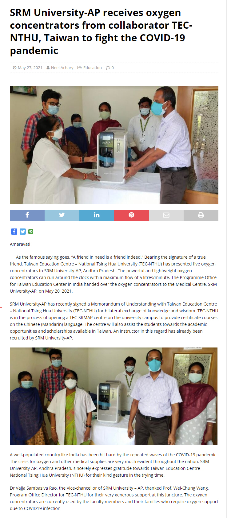 SRM University-AP receives oxygen concentrators from collaborator TEC-NTHU