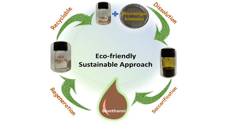 Microalgae is recently considered one of the promising biomasses for the production of renewable energy such as biodiesel and bioethanol. Microalgae are tiny photosynthetic organisms that utilise atmospheric CO2, water and sunlight to produce carbohydrates and lipids, which can be converted into renewable fuels. Compared to higher plants, microalgae is a good platform for bioethanol production as they do not contain any lignin in their cell composition, which makes pre-treatment for biomass hydrolysis easy. In the present study, Dr Pancha and his team explored the use of green solvents ionic liquids (ILs) and deep eutectic solvents (DESs) for microalgal hydrolysis. They observed that among the eight tested ionic liquids, ethyl ammonium nitrate (EAN) resulted in the highest saccharification yield of 95.5%. Whereas, among hydrophobic deep eutectic solvents, menthol: lactic acid (Me: LA) exhibited the highest saccharification yield of 85.7% and also did not require any additional high temperature or other pre-treatments for biomass hydrolysis, indicating as the potential solvent system for microalgal biomass hydrolysis. Overall, the present study results indicated that the identified IL and DES could be used as a green and sustainable alternative for the pre-treatment of microalgal biomass for bioethanol production.