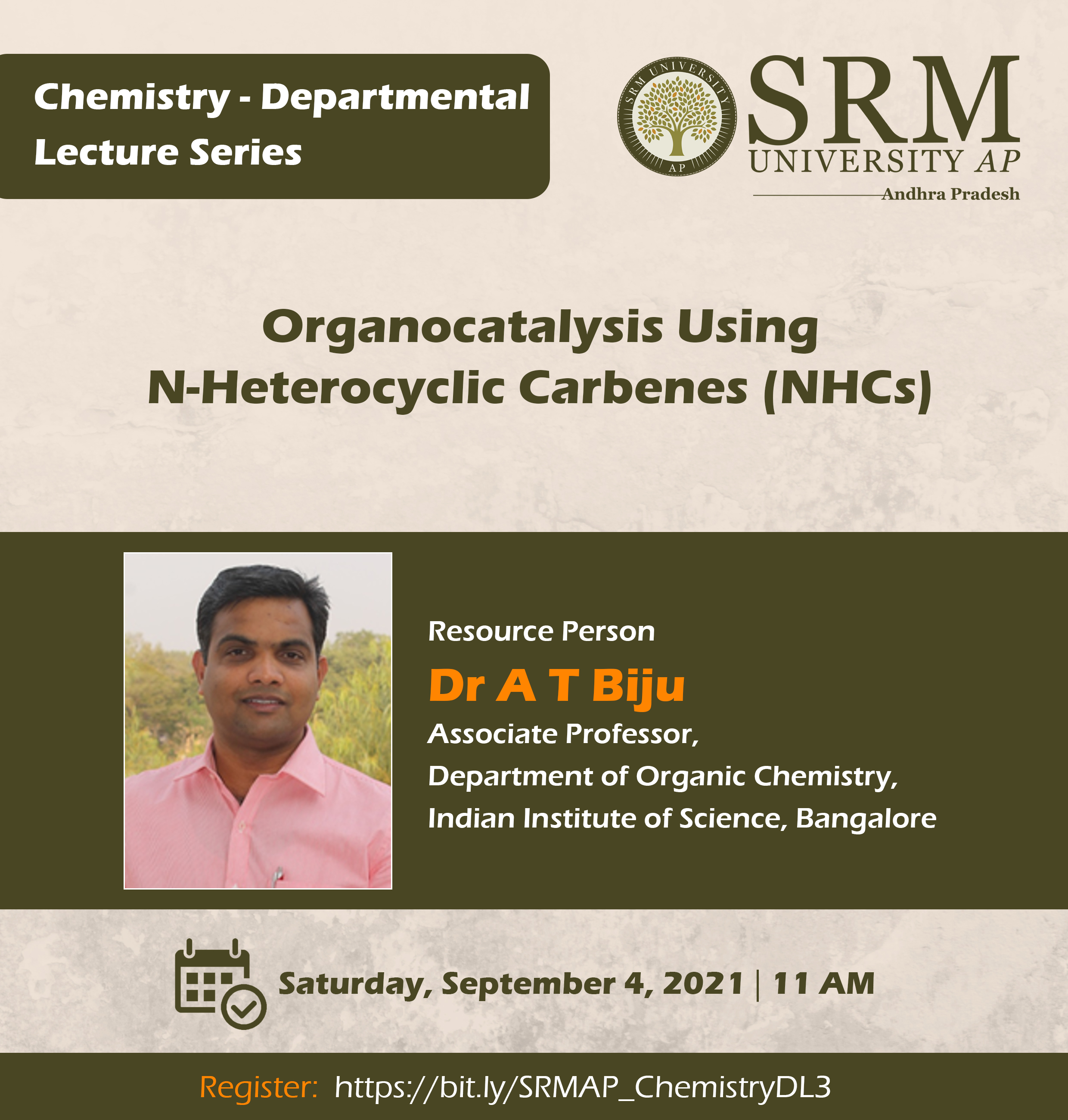 Continue reading →Chemistry Departmental Lecture Series brings another captivating webinar on “Organocatalysis Using N-Heterocyclic Carbenes (NHCs)”. Dr A T Biju, Associate Professor, Department of Organic Chemistry, Indian Institute of Science, Bengaluru, will deliver the keynote address on Saturday, September 04, 2021, at 11 am.