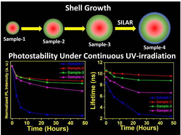 More importantly, these results highlight the impact of shell thickness on the excited state interactions of green-emitting g-QDs and conclude that g-QDs with a relatively thin shell can be a better choice as photoactive materials for photocatalysts, photodetectors, and solar cells.