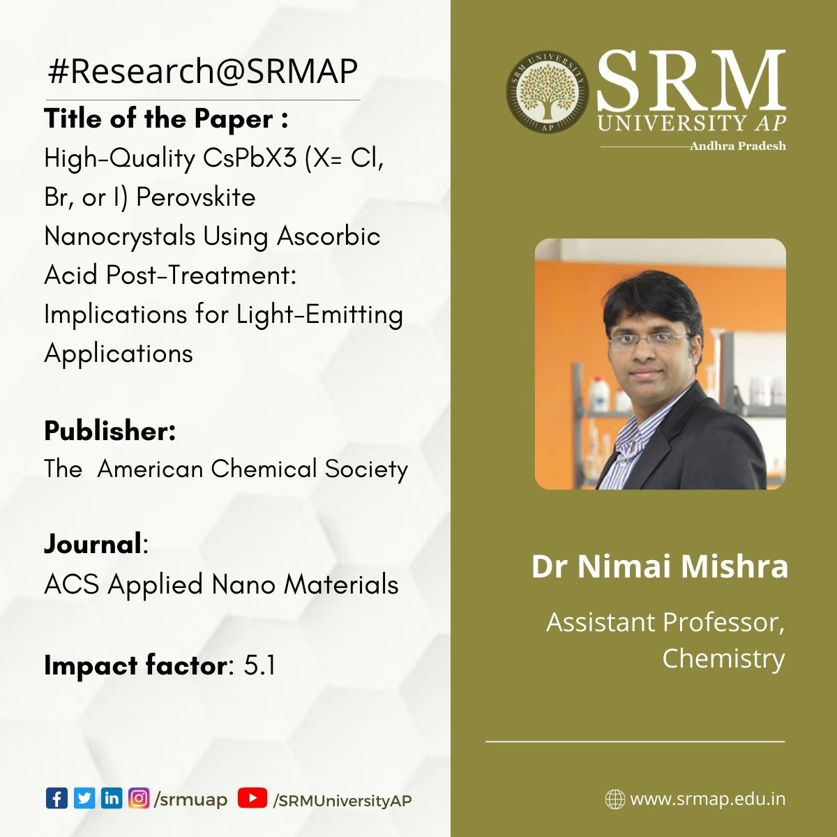 Dr Nimai Mishra, Assistant Professor, Department of Chemistry, SRM University-AP, Andhra Pradesh, along with his research group comprising of students pursuing PhD under his supervision, Ms VG Vasavi Dutt, Mr Syed Akhil, Mr Rahul Singh, and Mr Manoj Paalabathuni have published a research article titled “High-Quality CsPbX3 (X = Cl, Br, or I) Perovskite Nanocrystals Using Ascorbic Acid Post-Treatment: Implications for Light-Emitting Applications” in the Journal “ACS Applied Nano Materials” (published by The American Chemical Society) having an impact factor of ~5.1.