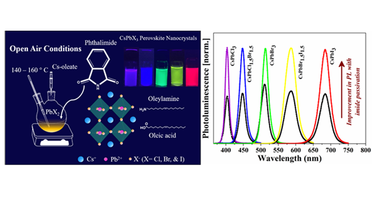 In this article, Dr Mishra’s research group demonstrates that incorporating an additional ligand can further enhance the optical properties and stability of NCs. Here, we introduced phthalimide as a new surface passivation ligand into the oleic acid/oleylamine system in situ to get near-unity photoluminescence quantum yield (PLQY) of CsPbBr3 and CsPbI3 perovskite NCs. We observed, phthalimide passivation dramatically improves the stability of CsPbCl3, CsPbBr3, and CsPbI3 NCs under ambient light and UV light. The PL intensity is recorded for one year which showed a dramatic improvement for CsPbBr3 NCs. Nearly 11% of PL can be retained even after one year for phthalimide passivated samples, on the other hand, the PL of as-synthesized NCs completely diminishes in four months. CsPbCl3 NCs exhibit 3 times higher PL with phthalimide and retain 12% PL intensity even after two months while PL of as-synthesized NCs completely diminishes by then. Under continuous UV light illumination, the PL intensity of phthalimide passivated NCs is well preserved while the as-synthesized NCs exhibit negligible PL emission in 2 days. About 40% and 25% of initial PL is preserved for CsPbBr3 and CsPbCl3 NCs in the presence of phthalimide. CsPbI3 NCs with phthalimide exhibit PL even after 2 days while the PL is rapidly declined for as-synthesized NCs in the first 10 hours. The presence of phthalimide in CsPbI3 NCs could maintain stability even after a week while the as-synthesized NCs under transition to non-luminescent phase within 4 days.