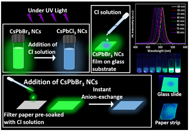 In this article, Dr Mishra’s research group demonstrated that the wide spectral tunability of CsPbBr3 perovskite nanocrystals (NCs) via instantaneous and facile anion exchange, make them a suitable candidate for chloride detection. Rapid anion-exchange processes between CsPbBr3 perovskite NCs and different chloride solutions were carried out in ambient conditions. The resultant anion-exchanged CsPbCl3-xBrx NCs preserved the structural properties and exhibited a remarkable blue shift in photoluminescence spectra. This forms a basis for the detection of chloride ions in water. This has been applied with the limit of detection up to 100 µM. The detection strategies were not only limited to the direct addition of chloride solutions to NCs, but they also showed a visual colour change under UV light when the chloride solution is drop-casted on CsPbBr3 films that are deposited on glass substrates. Furthermore, the detection strategy is established by drop-casting CsPbBr3 NCs onto paper strips that are pre-soaked in chloride solutions. A considerable blue shift in fluorimetry proves them to be an excellent sensing medium as practical spectrochemical probes for on-site detection of chlorides. Based on this, a colour chart and selectivity chart to access the presence of chlorides and their concentration is also demonstrated.