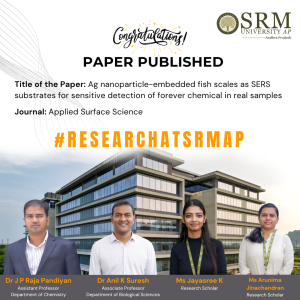 Surface-Enhanced Raman Spectroscopy (SERS), a technique that helps scientists detect tiny amounts of substances, is used for checking pollutants in our environment and the food we eat. However, using this method can be tricky because sometimes other substances can interfere. To overcome these challenges, scientists are working on better ways to prepare samples and analyse the data with a quick and easy way to find harmful pollutants called PFOSA in human urine, soil, and water using a fish scale-based substrate. This remarkable research titled, “Ag nanoparticle-embedded fish scales as SERS substrates for sensitive detection of forever chemical in real samples” by faculty members from the Department of Chemistry and Department of Biological Sciences, Dr J P Raja Pandiyan and Dr Anil K Suresh, along with their research scholars, Ms Jayasree K and Ms Arunima J, have opened up new avenues, demonstrating a significant advancement in the field of science.