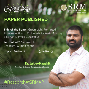 In a remarkable contribution to the field of green chemistry, Dr Jaidev Kaushik, Assistant Professor in the Department of Chemistry, has published a significant research paper titled “Green Light Promoted Photoreduction of Carbonate to Acetic Acid by Zinc Ash-Derived ZCu@ZnO” in the prestigious Q1 journal, ACS Sustainable Chemistry & Engineering, with an impressive impact factor of 7.1.