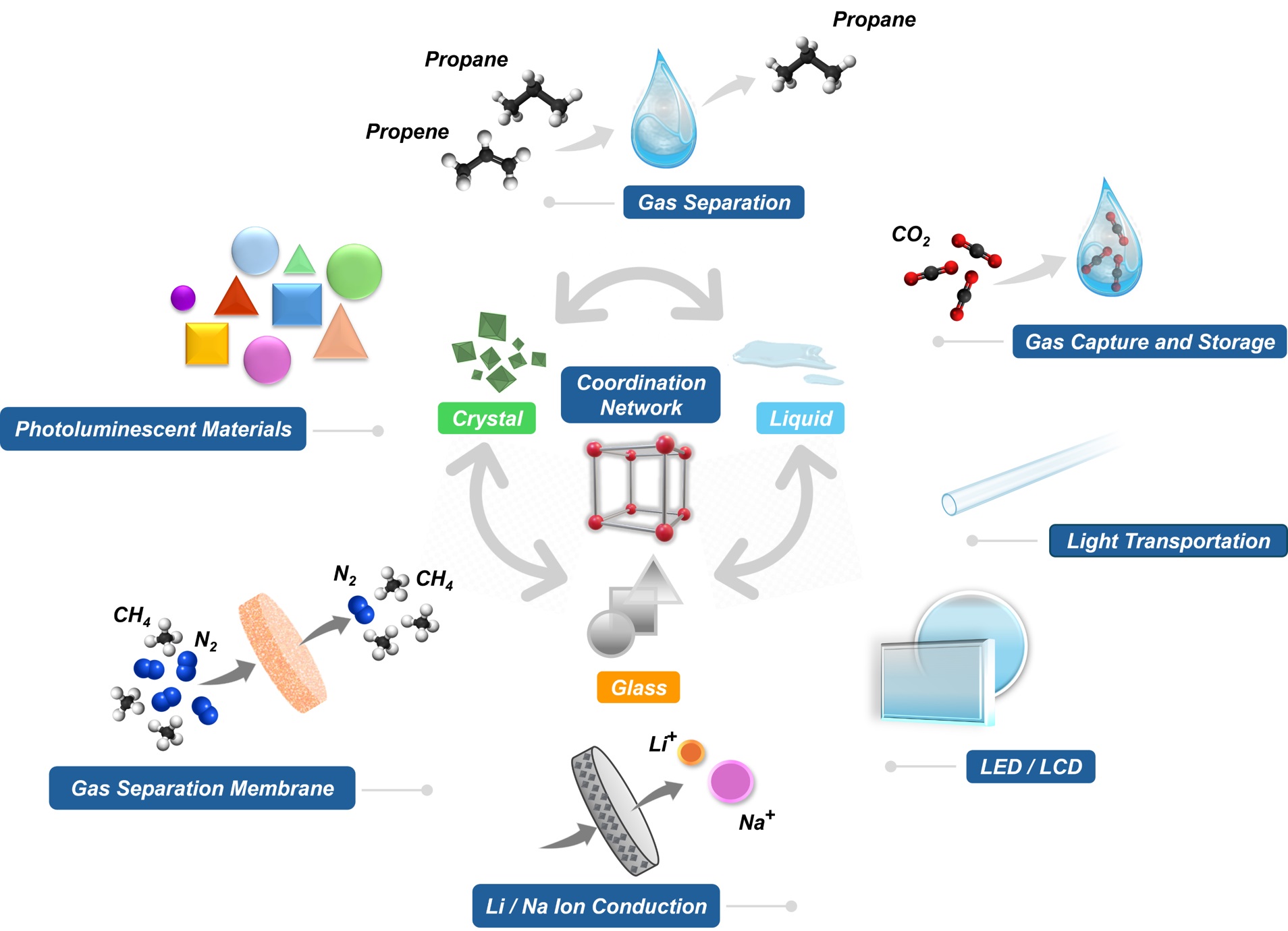 Brief: Our research group is developing new synthetic protocols to design Coordination Networks (Metal-organic frameworks/Coordination Polymers)-based Crystal-Glass Composites toward the application of atmospheric water harvesting (AWH), Li/Na-ion conducting solid-state electrolytes, photoactive materials, gas separating membranes, and heterogeneous catalysis for the transformation of gaseous molecules into industrially important liquid fuels. The strategy to achieve these fascinating materials involves phase transition and dynamicity of the molecules in different states of matter.
