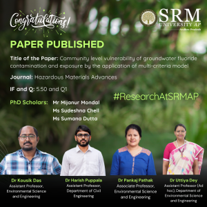 Continue reading →Assistant Professors – Dr Kousik Das, Dr Harish Puppala, Associate Professor- Dr Pankaj Pathak, Uttiya Dey, along with Research Scholars – Mr Mijanur Mondal, Ms Sudeshna Chell, Ms Sumana Dutta, and Ms Pankaj Kumar come up with an interdisciplinary research breakthrough in their paper, “Community-Level Vulnerability of Groundwater Fluoride Contamination and Exposure by the Application of Multi-Criteria Model.” The authors examine fluoride exposure in villages like Chintal Cheruvu, Rompicherla, Shantamangalur, Thimmapur, and Nadendla.
