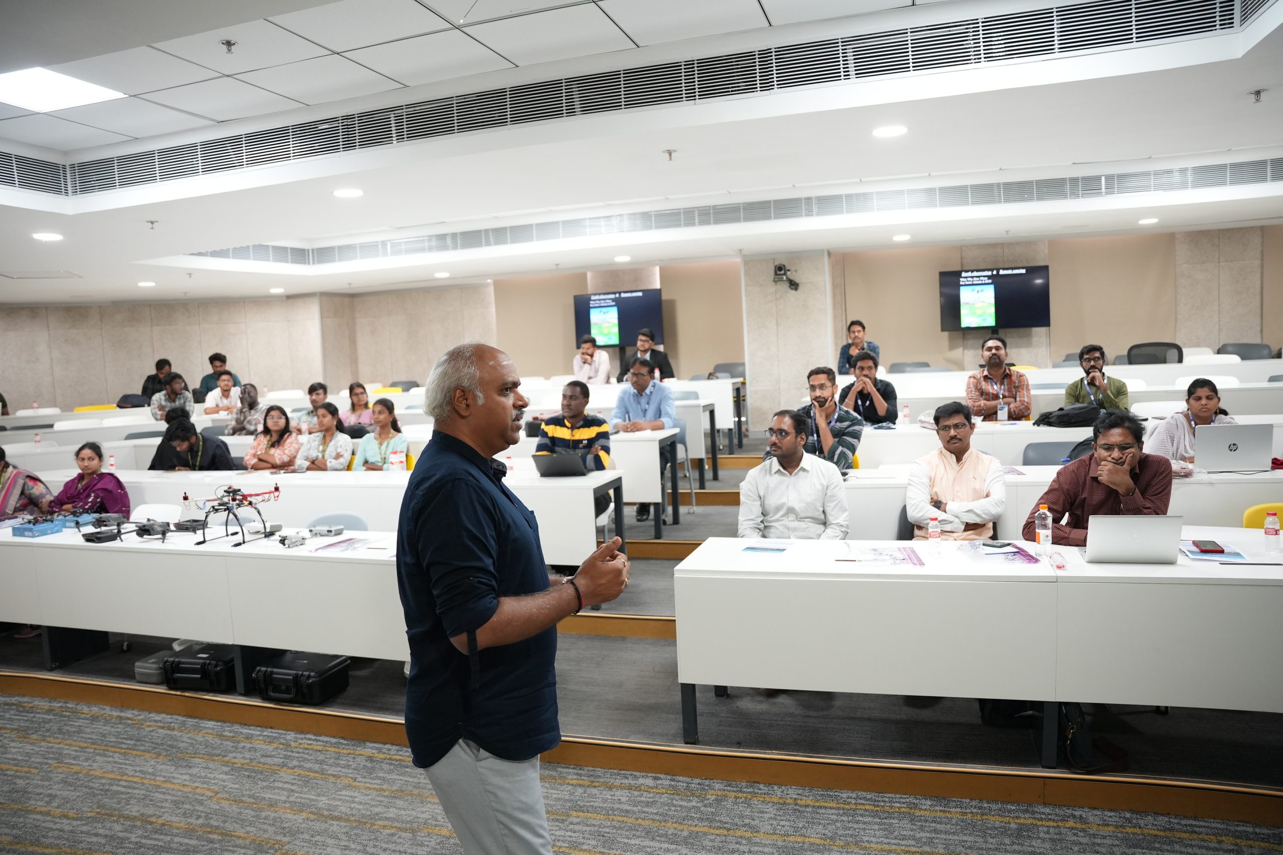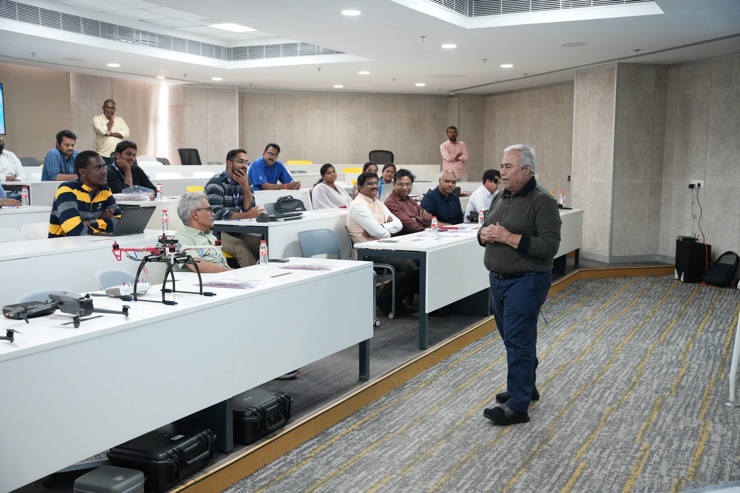 Day 2 was all action! Participants built drones from scratch, configured firmware, and took their creations to the field for real-world flying experience. The advanced session, led by Dr Pranav RT Peddinti (Centre for Drone Tech), Dr Harish Puppala (Centre for Geospatial Technology), and Mr Pruthiv and Mr Manjunath (Skyeris Aerotech), showcased high-end drones with multispectral and thermal sensors—bridging theory with cutting-edge practice.