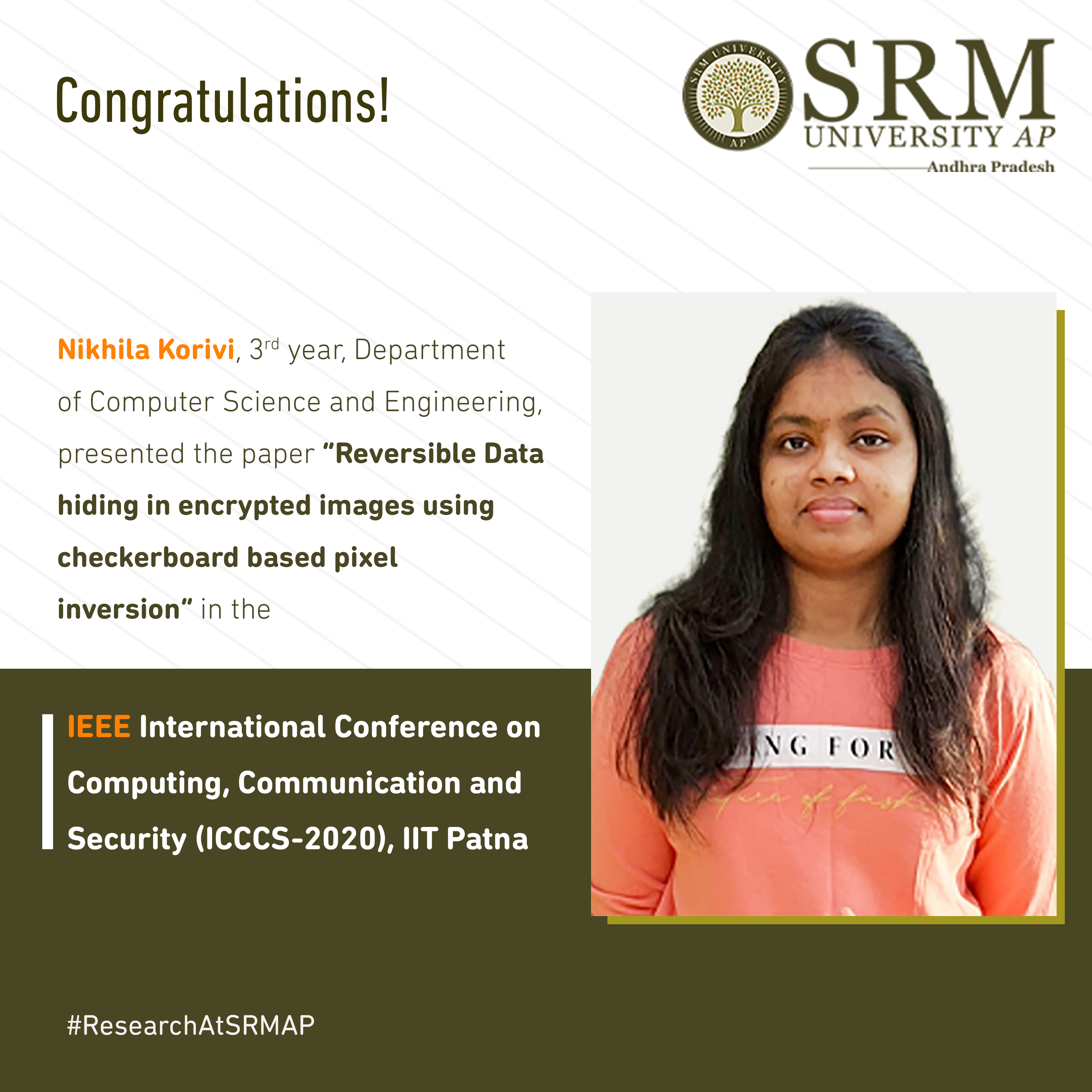 Nikhila Korivi, third year, Department of Computer Science and Engineering, SRM University- AP, Andhra Pradesh was steered by Dr Manikandan V M, Assistant Professor, Department of CSE, to present the pioneering research paper “Reversible Data hiding in encrypted images using checkerboard based pixel inversion” in the IEEE International Conference on Computing, Communication and Security (ICCCS-2020), IIT Patna, held on October 14-16, 2020.
