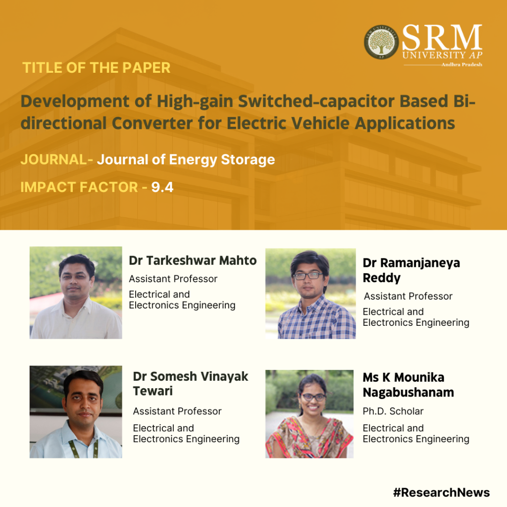 Electric Vehicles are in vogue today, thanks to the heightened environmental concerns, greater availability of models, increased cost competitiveness and improved vehicle ranges. To contribute to the growing field of electric vehicle technology, Assistant Professors, Dr Tarkeshwar Mahto, Dr Somesh Vinayak Tewari and Dr Ramanjaneya Reddy from the Department of Electrical and Electronics Engineering at SRM University-AP along with the research scholar, Ms K Mounika Nagabushanam, conducted a study and published a research paper titled “Development of High-Gain Switched-Capacitor Based Bi-Directional Converter for Electric Vehicle Applications.” The team’s research focuses on creating a bi-directional DC-DC converter that enables power flow from the battery to the motor and vice versa while maintaining necessary voltage gains and ensuring improved efficiency and low cost.