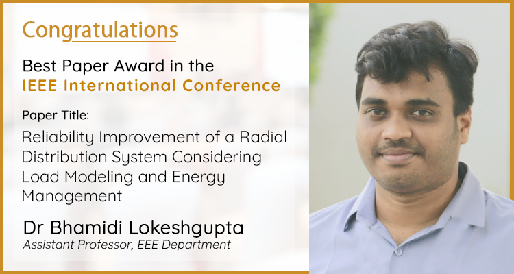 Studies that open new possibilities into some of the gripping issues in the scientific domain have transformed SRM University-AP into the epicentre of cutting-edge research and investigations. We are proud to announce that Dr B Lokeshgupta, Assistant Professor of the Department of Electrical and Electronics Engineering has won the Best Paper Award at IEEE Second International Conference on Power, Control and Computing Technologies ICPC²T 2022 held at NIT Raipur, Chhattisgarh. The paper titled “Reliability Improvement of a Radial Distribution System Considering Load Modeling and Energy Management” was co-authored by Dr S Sivasubramani and Mr. Ram Prakash from IIT, Patna. The research gives new insight into energy management and power consumption patterns.