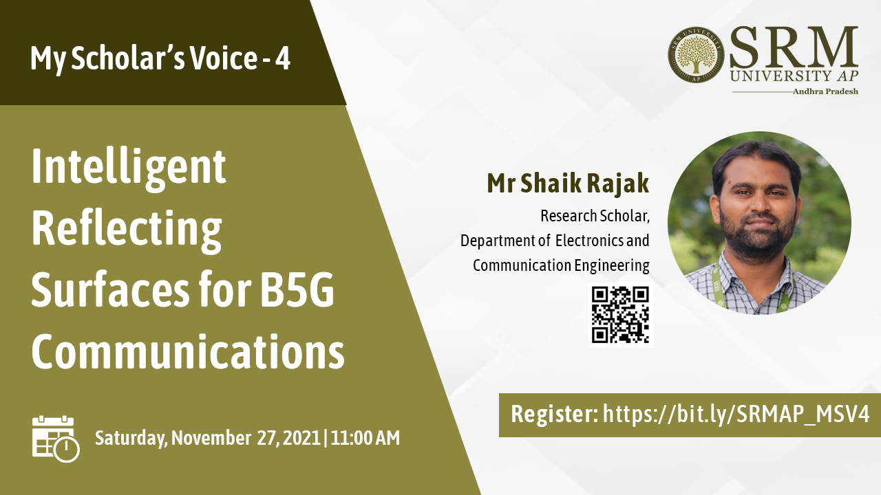 The world of communications is constantly changing. It is transforming, evolving, and becoming better, faster, and smarter. So, for the fourth edition of My Scholar’s Voice (MSV-IV) we would like to present Shaik Rajak from the Department of Electronics and Communications Engineering for a titillating discussion on “Intelligent Reflecting Surfaces for B5G Communications” on Saturday, November 27, 2021, at 11.00 am.