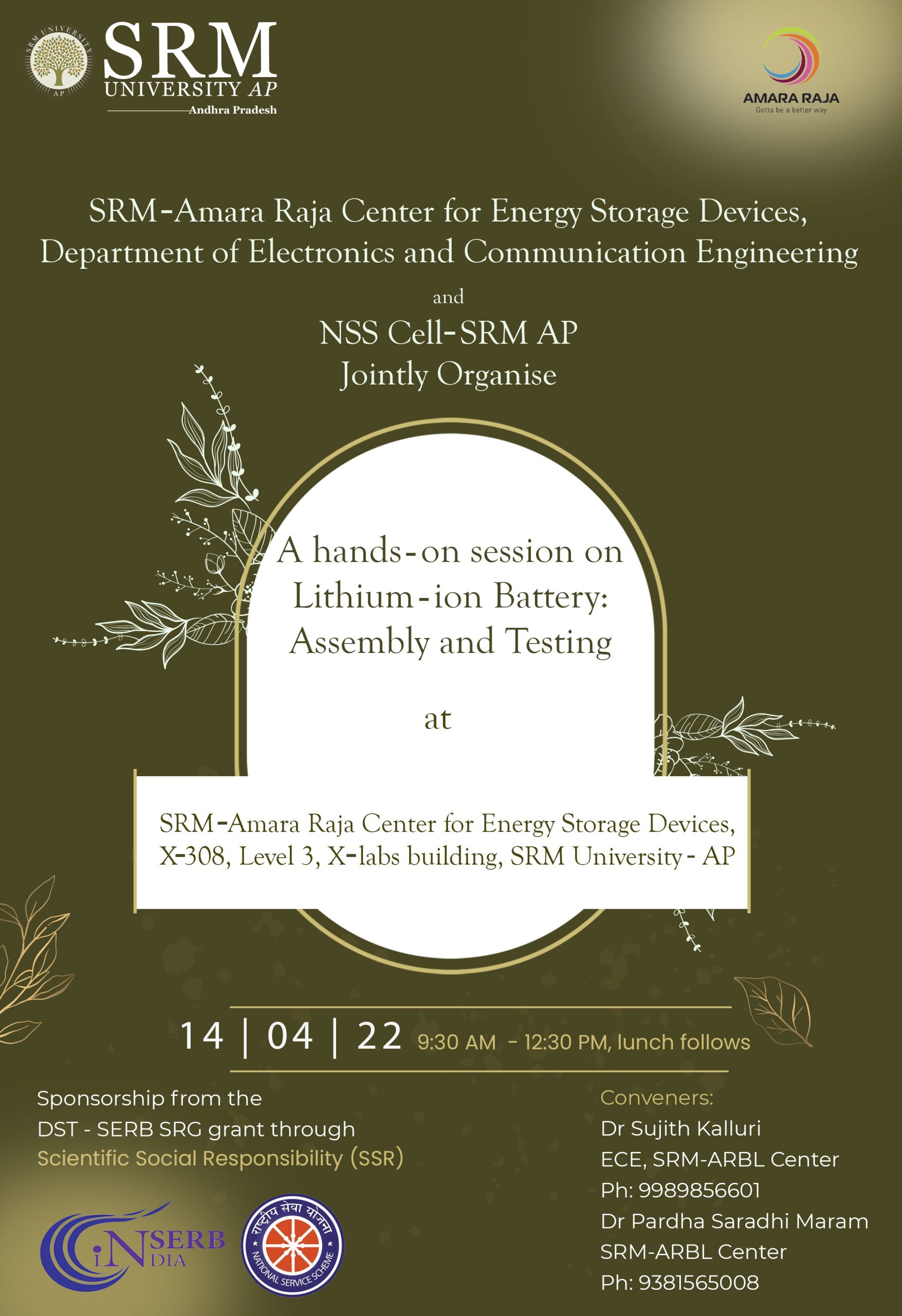 Taking the current scenario into account,imparting hands-on training on cutting-edge developments is an excellent exercise to inculcate scientific spirit in young minds. Such initiatives should be actively promoted to equip students on par with the fast-evolving technological realm. We are delighted to announce that the SRM-Amara Raja Center for Energy Storage Devices, Department of Electronics and Communication Engineering, collaborates with NSS Cell-SRM AP to organise a “Hands-on Session on Lithium-ion Battery: Assembly and Testing” with the sponsorship from the DST-SERB Start-up Research Grant (SRG).
