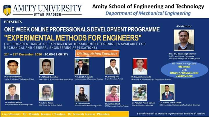 Prof Priya Ranjan and Dr Anirban Ghosh delivered an invited lecture titled “Experimental Methods for Engineers” at the 5-Days Online Professional Development Programme by Amity University Noida.