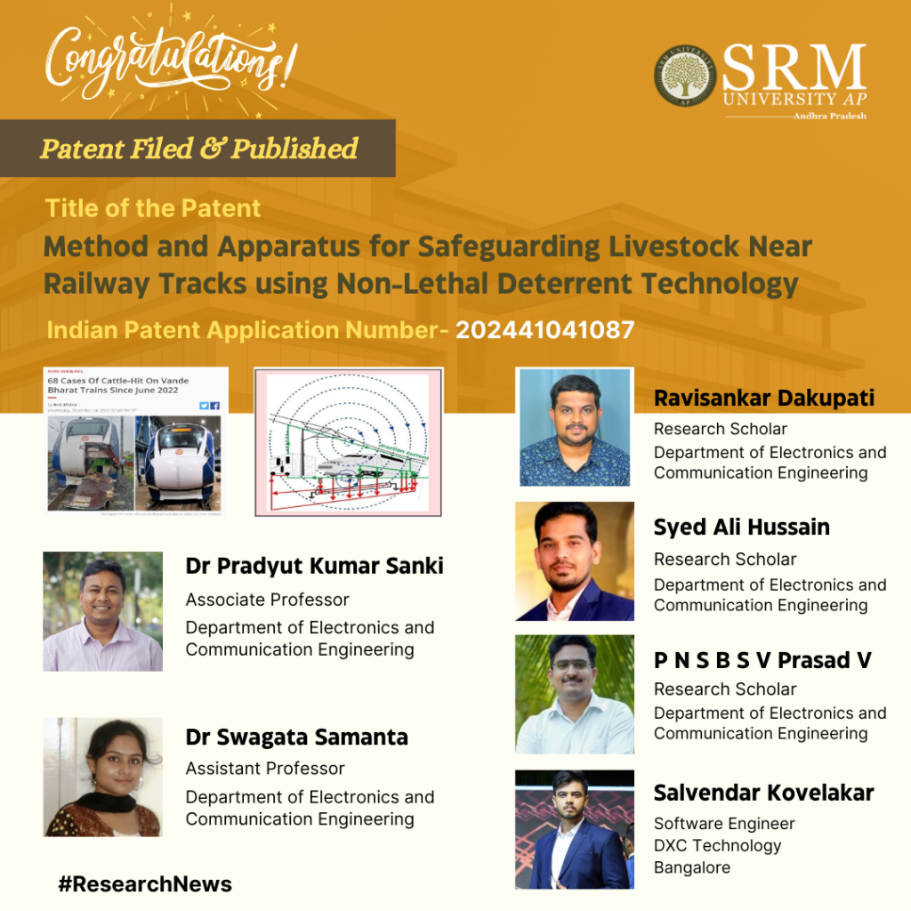 Continue reading →The Department of Electrical and Communication Engineering at SRM University-AP is delighted to announce the publication of a patent by its faculty, including Associate Professor Dr Pradyut Kumar Sanki and Assistant Professor Dr Swagata Samanta, along with research scholars Ravisankar Dakupati, Syed Ali Hussain, and P N S B S V Prasad V. The patent, titled “Method and Apparatus for Safeguarding Livestock Near Railway Tracks using Non-Lethal Deterrent Technology,” has introduced a groundbreaking solution that helps prevent accidents of wandering cattle. This innovative technology promises to protect livestock and minimise economic losses for cattle owners while championing the advancement of technology in countries like India.