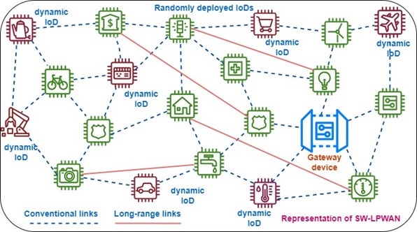 To support the rapid growth of Internet of Things (IoT) applications, networking technologies like Low-Power Wide-Area Networks (LPWANs) are evolving to provide extended network lifespan and broader coverage for Internet of Things Devices (IoDs). These technologies are highly effective when devices remain stationary under static conditions. However, practical IoT applications, ranging from smart cities to mobile health monitoring systems, involve heterogeneous IoDs that move dynamically, leading to changing network topologies. Typically, dynamic networks use multi-hop data transmission schemes for communication, but this method presents challenges such as increased data latency and energy imbalances. To address these issues, this patent introduces a novel approach that integrates recent advancements in social networks, specifically Small-World Characteristics (SWC), into LPWANs using Reinforcement Learning. Specifically, the SWCs are embedded into heterogeneous LPWANs through the Q-learning technique. The performance of the developed heterogeneous Small-World LPWANs is then evaluated in terms of energy efficiency (including the number of alive and dead IoDs, as well as network residual energy) and data transmission delay within the network.