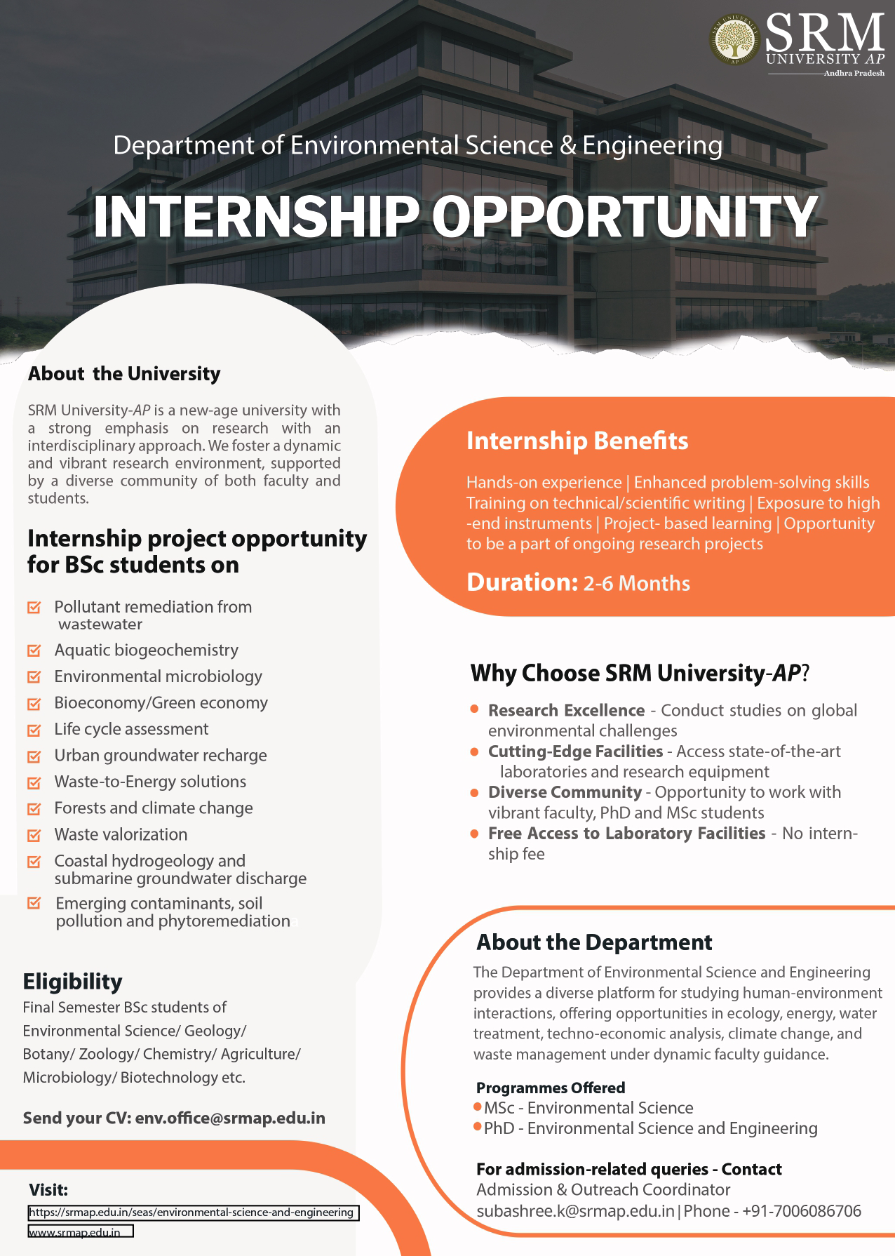 Intership oppertinities are available for undergraduate students. Interested candidates may send their CV to env.office@srmap.edu.in