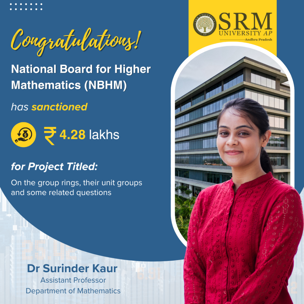 Continue reading →Dr Surinder Kaur, Assistant Professor at the Department of Mathematics is making significant contributions to the mathematical community and SRMAP’s research wing, her research on understanding the group rings and addressing challenges such as the isomorphism problem for group algebra through her project has earned her a funding of ₹ 4.28 lakh from the prestigious National Board for Higher Mathematics (NBHM). Dr Kaur’s impressive research work has become a source of inspiration to many. Given below are some details on her project titled, “On the group rings, their unit groups and some related questions”