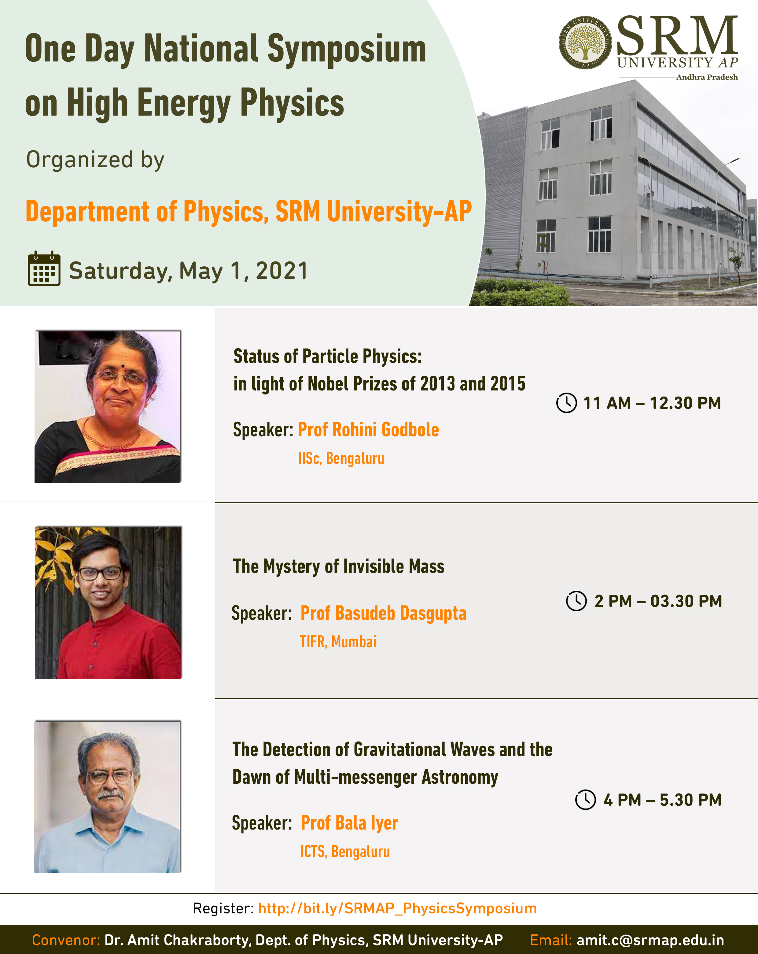 Continue reading →The Department of Physics, SRM University-AP, Andhra Pradesh, has organised a National Symposium on High Energy Physics on Saturday, May 1, 2021, at 11 am. Leading Physicists of the nation are going to share their perspective on the progress and recent challenges in Particle Physics, Dark Matter Physics and Gravitational-Wave Astronomy. Padma Shri awardee Prof Rohini Godbole, theoretical particle physicist at the Indian Institute of Science (IISc), Bengaluru, will present the inaugurating talk on “Status of Particle Physics: in light of Nobel Prizes of 2013 and 2015”. Prof Basudeb Dasgupta from the Tata Institute of Fundamental Research (TIFR), Mumbai, will join us for the next session on “The Mystery of Invisible Mass”. The last talk of the day will be given by Prof. Bala Iyer from the International Centre for Theoretical Sciences (ICTS), Bengaluru. He will shed light on “The Detection of Gravitational Waves and the Dawn of Multi-messenger Astronomy”.