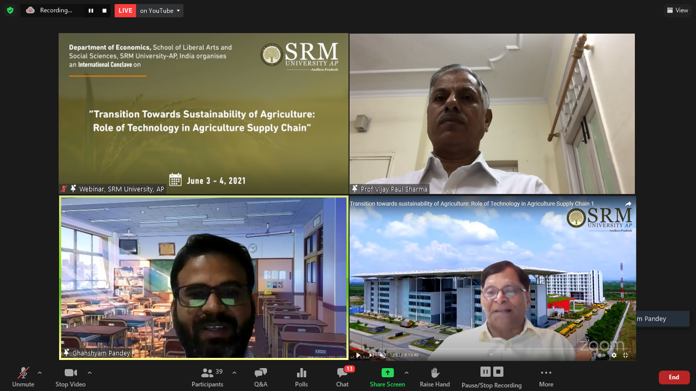 Continue reading →Department of Economics, SRM University-AP organised the International Conclave on “Transition towards sustainability of Agriculture: Role of Technology in Agriculture Supply Chain” on June 3-4th, 2021. Prof Vijay Paul Sharma, Chairman, Commission for Agriculture Costs and Price (CACP), Ministry of Agriculture & Farmer Welfare, GoI, India, was the chief guest of the event. The tope agricultural economist from India and abroad from the reputed institutions, i.e., Arizona State University, USA; Bangabandhu Sheikh Mujibur Rahman Agricultural University, Bangladesh; ICAR-NIAP; IFPRI South Asia Office Delhi; JNU, IIMA, IIMB, IGIDR Mumbai, Delhi School of Economics; Institute of Economic Growth; Symbiosis School of Economics, Pune; Central University of Punjab; Central University of Jammu; Sharda University, Noida; Amity University, Noida; PAU, Ludhiana; AN Sinha Institute of Social Sciences, Patna; Centre for Development Studies; Thrivanthapuram delivered lectures and participated in Panel Discussions in the two-day event.