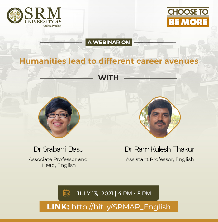 Continue reading →Humanities is the discipline that studies languages, histories and cultures. The BA English course at SRM University-AP offers students knowledge of the language and develops in them skills that foster their career paths. Dr Srabani Basu, Associate Professor and Head of the Department of English and Dr Ram Kulesh Thakur, Assistant Professor in the Department will explicate the course curriculum, subjects, scope, specialisation, and available job avenues of BA English course in a virtual session titled “Humanities lead to different career avenues” on July 13, 2021, at 4.00 pm.
