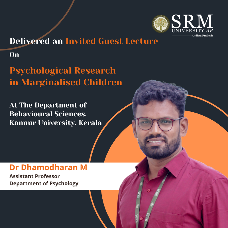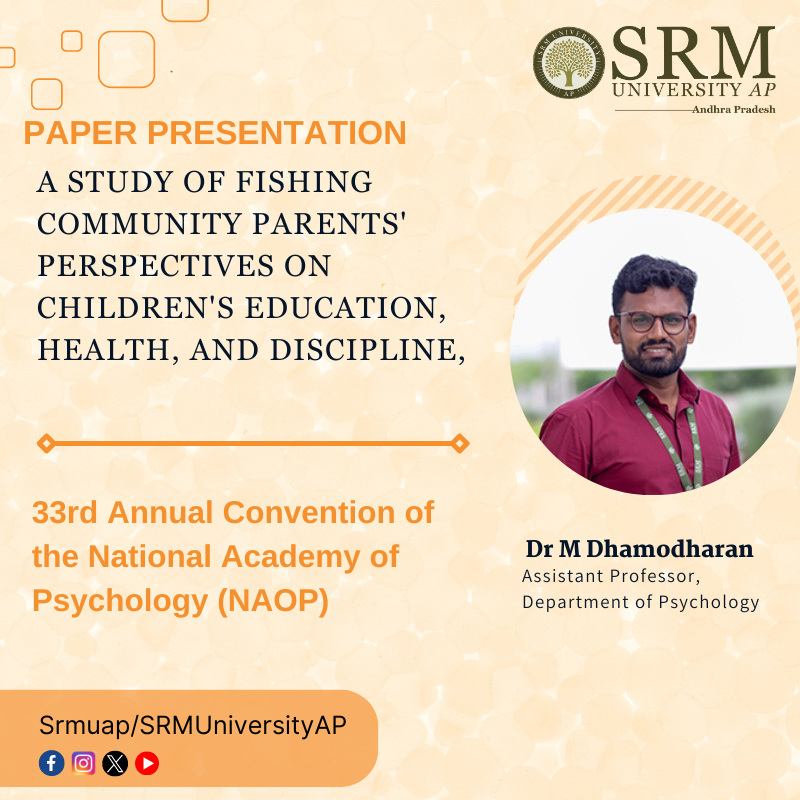 The Department of Psychology at SRM University-AP is pleased to announce Dr Dhamodharan’s pivotal insights, which surfaced at the culmination of the 33rd Annual Convention of the National Academy of Psychology (NAOP), orchestrated by the Department of Applied Psychology at GITAM School of Humanities and Social Sciences, Vishakhapatnam. Dr Dhamodhran, Assistant Professor at the Department of Psychology published his paper, titled “A Study of Fishing Community Parents’ Perspectives on Children’s Education, Health, and Discipline,” which has received profound attention for its insightful analysis.