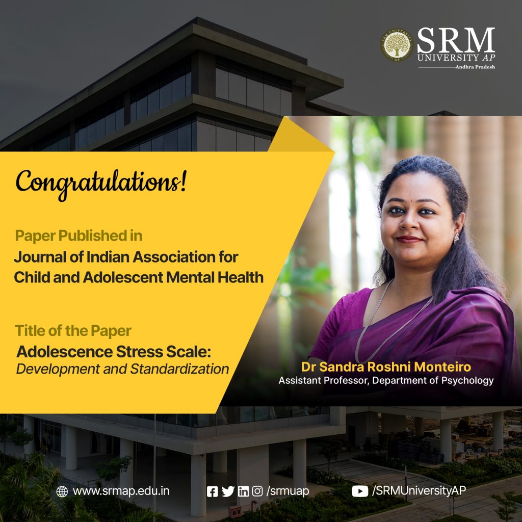 The research paper titled “The Adolescence Stress Scale: Development and Standardization” is a significant contribution to the field of psychology. The paper by Dr Sandra Roshni Monteiro, Assistant Professor at the Department of Psychology in SRM University-AP featured in The Journal of Indian Association for Child and Adolescent Mental Health and provides a detailed account of the development and standardisation of the scale, highlighting its importance and relevance. Dr Monteiro has developed a comprehensive stress scale that aims to evaluate the psychometric issues faced by school-going adolescents.