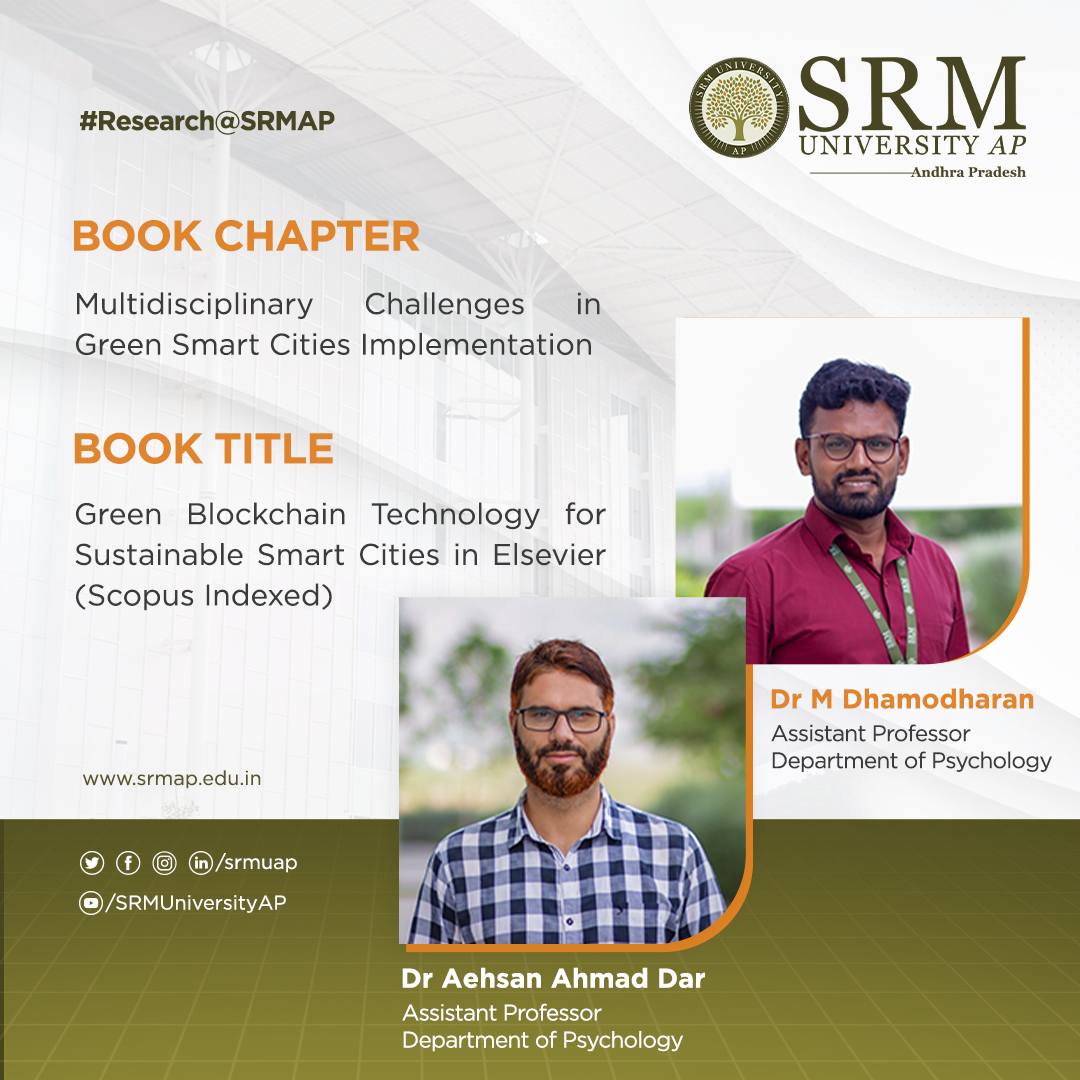 Assistant Professors Dr Dhamodharan M and Dr Aehsan Ahmad Dar from the Department of Psychology have published a chapter titled Multidisciplinary Challenges in Green Smart Cities Implementation in the book Green Blockchain Technology for Sustainable Smart Cities in Elsevier, which is Scopus Indexed.