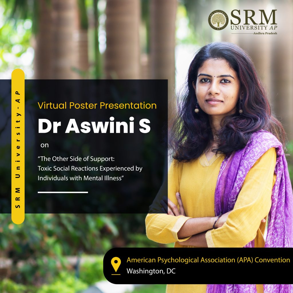 Continue reading →In a proud moment that highlights our institution’s commitment to excellence and innovation, we are thrilled to share the success of a recent poster presentation that graced the global stage.Dr Aswini S, Assistant Professor at the Department of Psychology at SRM University-AP recently represented the varsity at the American Psychological Association (APA) Convention in Washington, DC from August 3 – 5, 2023. The occasion was a prestigious Poster Presentation, titled, “The Other Side of Support: Toxic Social Reactions Experienced by Individuals with Mental Illness”