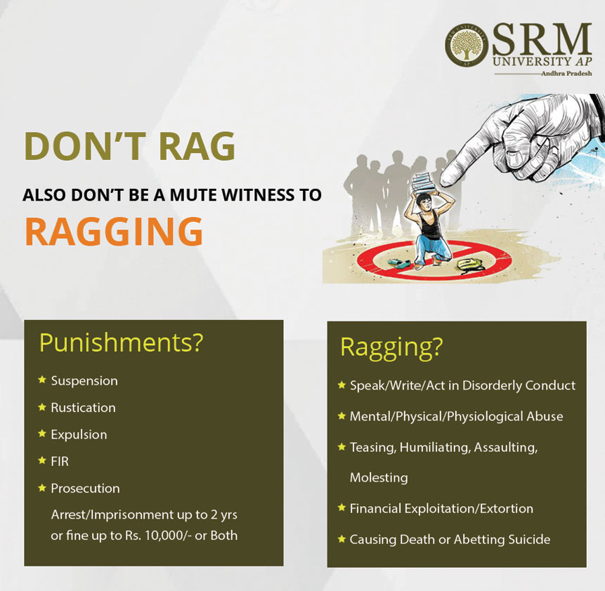 At SRM University-AP, we uphold a zero-tolerance policy towards ragging. Our commitment to providing a safe and welcoming environment for all students is unwavering. Ragging, in any form, is strictly prohibited, and any violations will be addressed promptly and rigorously in accordance with the law and university regulations. We strive to foster a culture rooted in respect, kindness, and inclusivity.