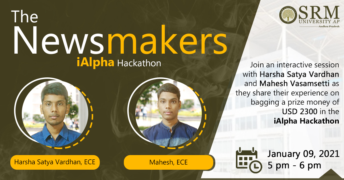 Continue reading →The Newsmakers presents an exhilarating session with Harsha and Mahesh, our winners at iHack Alpha Hackathon. iHack Alpha is an AI-Hackathon, where developers from all backgrounds were invited to solve real-world problems with innovative AI solutions, powered by sentient.io AI and Data platform. It was conducted over three weeks starting from December 2, 2020, and finished on December 27, 2020. The whole Hackathon was broadcasted online. Harsha and Mahesh, B.Tech students at Department of Electronics and Communication Engineering, won the grand cash prize of $2300 after defeating 1083 teams worldwide. Join the ceremonious occasion on January 9, 2021, at 5 pm to listen to the Winners’ experience. Know your peers better. Join them at 5 pm today.