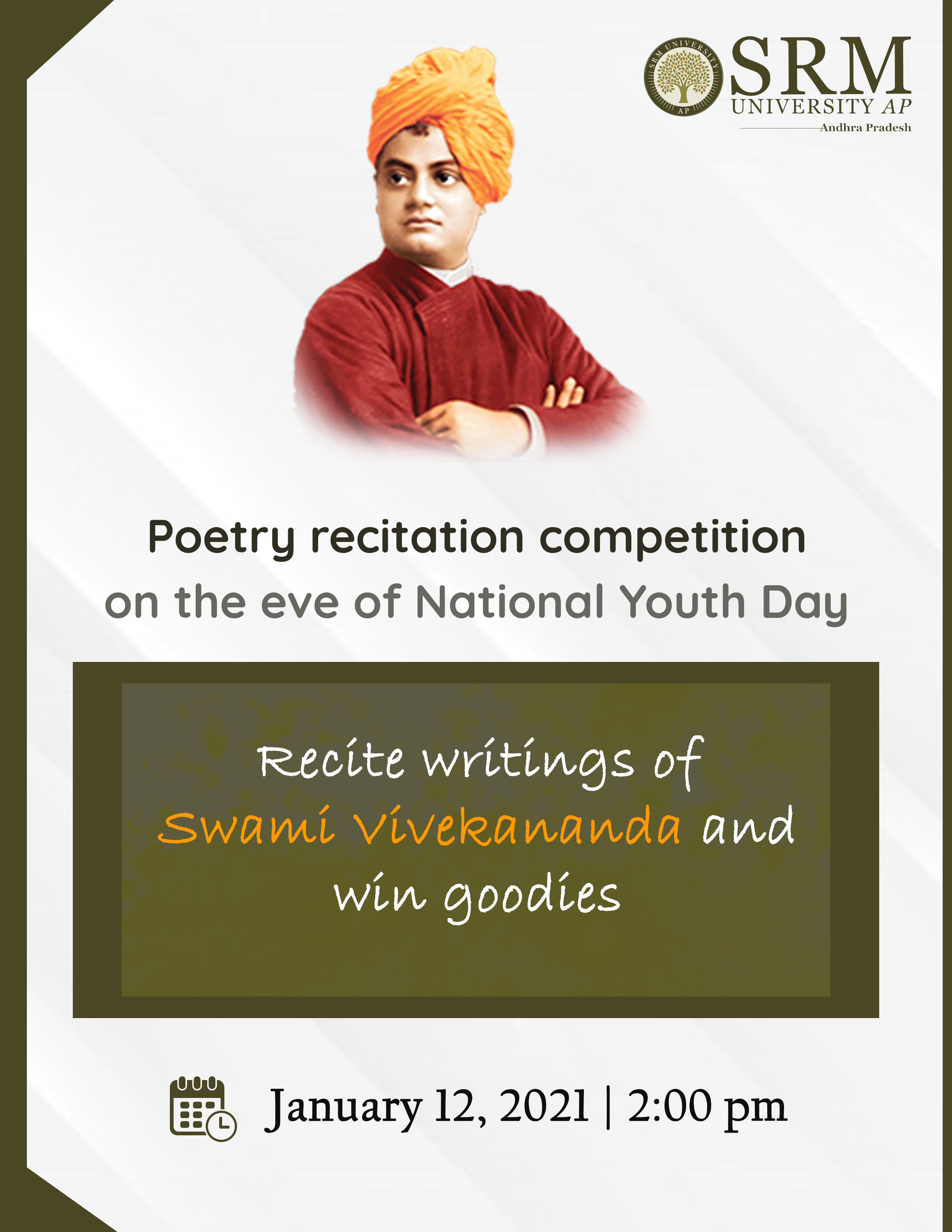 Continue reading →On the eve of the birth anniversary of Swami Vivekananda, Department of Student Affairs, SRM University-AP, Andhra Pradesh presents a Poetry Competition on January 12, 2021, at 2 PM. Being a spiritual leader and a reformer in India, Swami Vivekananda has perpetually inspired the youth, marking January 12, 2021, as the National Youth Day. During this contest, the participants will be remembering the remarkable contributions of Swami Vivekananda by reciting at least 20 lines of any poem written by the icon. In addition, the contestants are encouraged to encapsulate the poem in a few words for a clear depiction of the intriguing message presented by Swami Ji. The winner of the competition will receive goodies worth Rs 750 and the runner up will be awarded the second prize comprising of gifts worth Rs 500. All the students are urged to participate in the competition to get inspired by the teachings of Swami Vivekananda, and win exciting prizes and e-certificates.