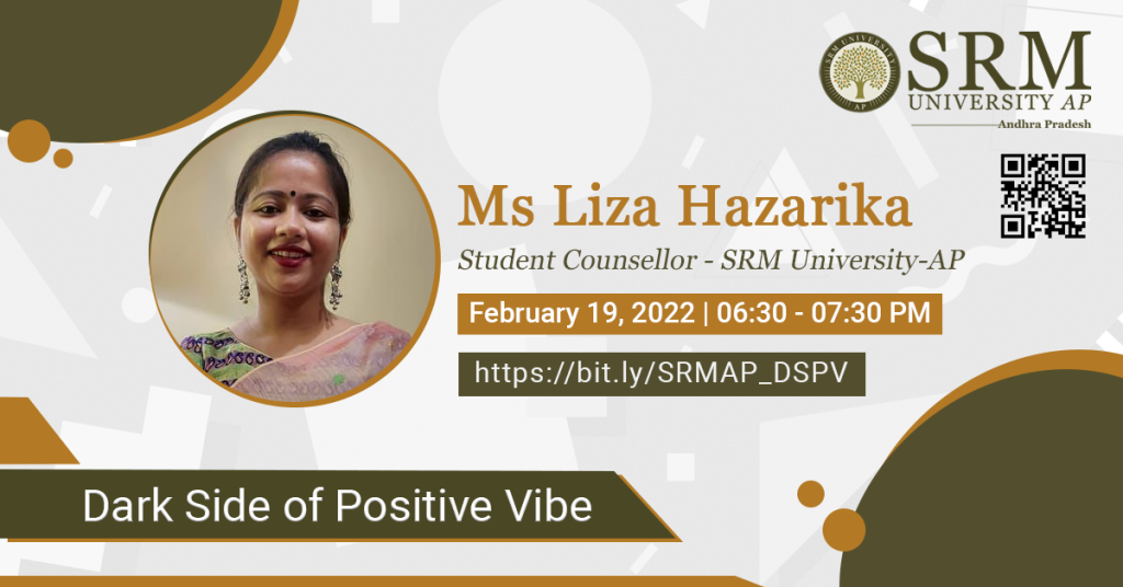 Ms Liza Hazarika, Student Counsellor, SRM University-AP is organising an exciting and informative session, Dark Side of Positive Vibes to throw light into the different shades of positivity. Learning to look at the brighter side of things is important; it is equally important to not ignore other inevitable impulses that shape up in your mind. Every emotion is meant to be experienced and prevailed over. It is a mixture of anger, fear, pain, envy, and disgust that makes you the real you.