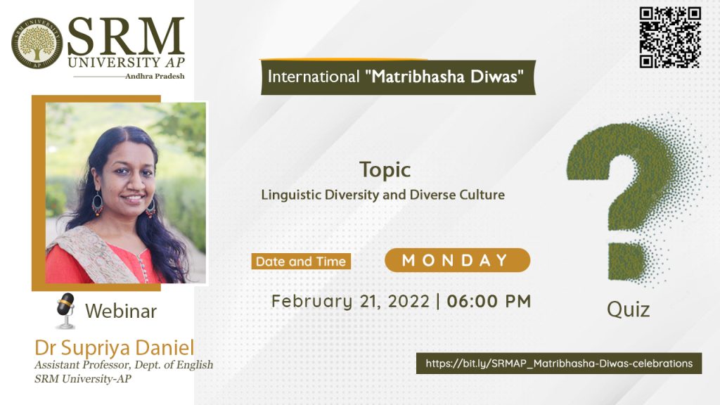 The Department of Student Affairs is organising a webinar and quiz competition on ‘Linguistic Diversity and Diverse Culture’ with Dr Supriya Daniel, Assistant Professor, Department of English, SRM-AP. This is an exciting opportunity for students to learn more about the essentiality of their linguistic and cultural legacy.