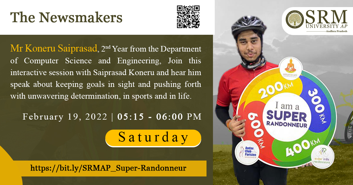 The Department of Student Affairs is bringing forth the next session of The Newsmakers with a talented sports achiever of our University, Saiprasad Koneru. Saiprasad Koneru exhibited exquisite stamina and speed as a cyclist, in the event organized by Audax Club India to bag the title of “Super Randonneur”.