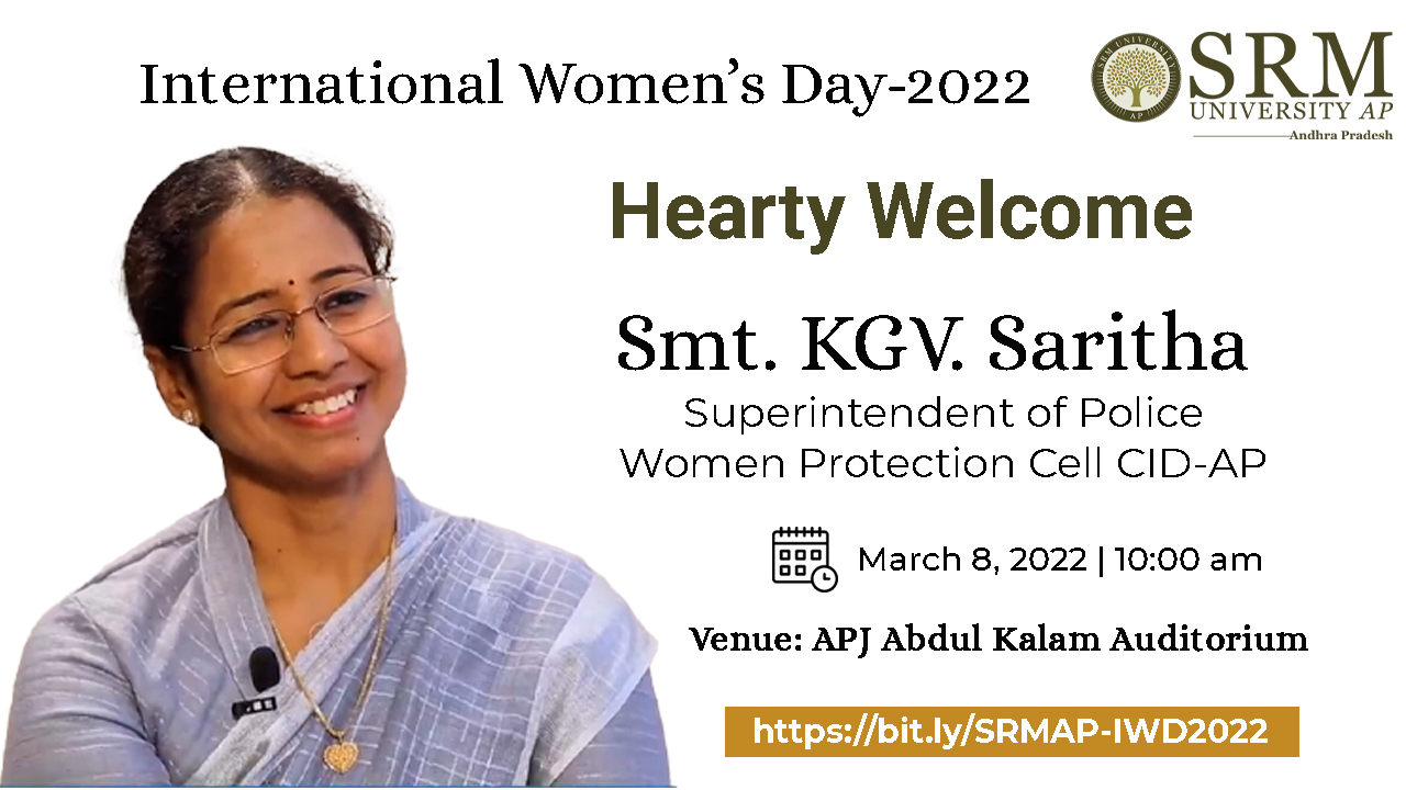SRM University-AP is all full of life to welcome yet another International Women’s Day on March 08, 2022. Women’s day is celebrated across the globe to honour womanhood and the incredible contributions they have made in the social, cultural, political, and economic domains. We are delighted to celebrate this women’s day with Smt KGV Saritha, Superintendent of Police, Women Protection Cell, CID-AP. The event is scheduled to be held on March 08, 2022, from 10.00 am onwards. Honourable Vice-Chancellor, Prof. VS Rao will preside over the function. Various cultural programmes are organised as part of the celebrations. Uttam Pratibha Mahila awards will be distributed, the women faculty members and leadership team will be felicitated. We take this opportunity to inculcate indomitable spirit and strong belief in oneself in the minds of every woman.