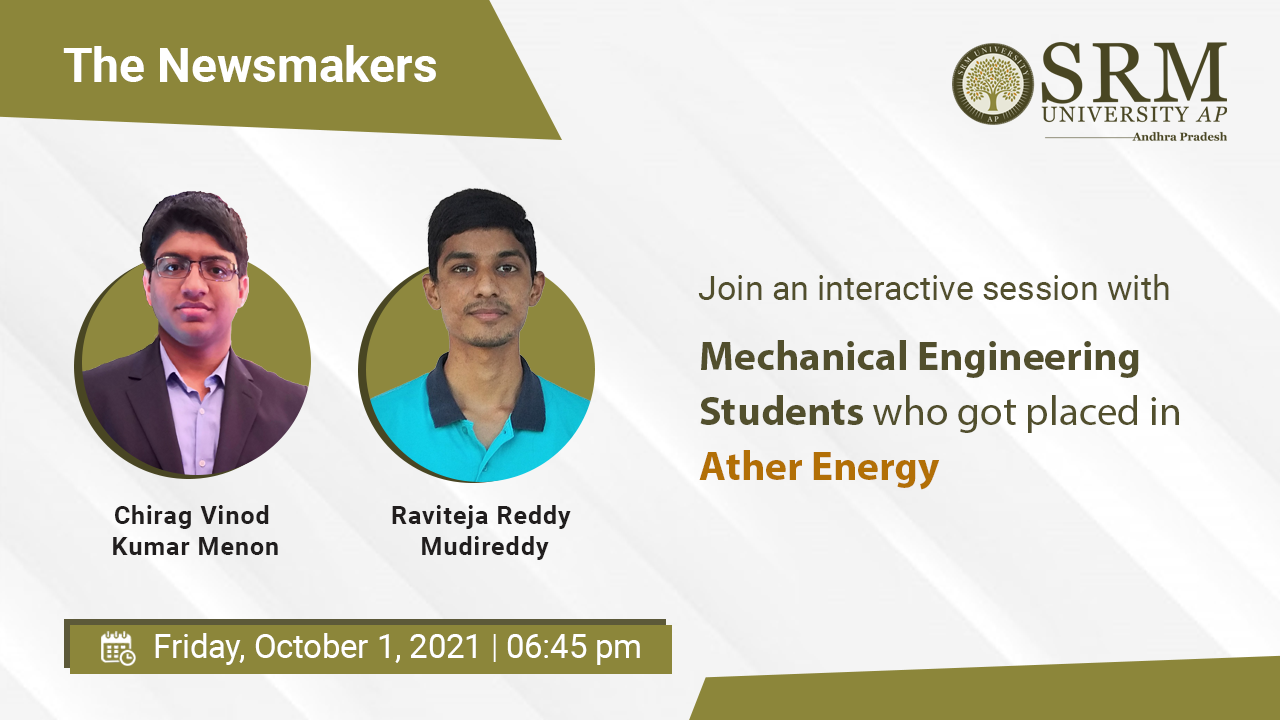 Chirag Vinod Kumar Menon and Mudireddy Raviteja Reddy from the Department of Mechanical Engineering are placed in Ather Energy with a CTC of 10 LPA. These two brilliant students will be featured in the latest episode of “The Newsmakers” on 01 October 2021, at 06.45 pm.