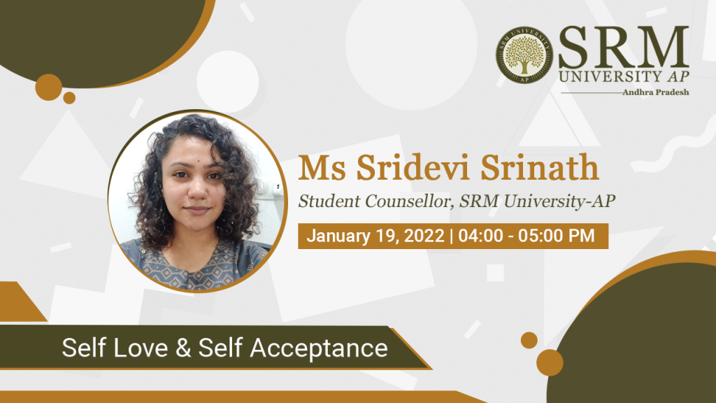 Self-acceptance and self-love are essential aspects of quality health and happiness. The Department of Student Affairs at SRM University-AP organises an interactive session with Student Counsellor Ms Sridevi Srinath to inculcate in students the importance of valuing and respecting oneself, embracing both the positive and negative facets. The session titled “Self-Love & Self-Acceptance” will be held on January 19, 2022, at 4.00 pm through online mode.