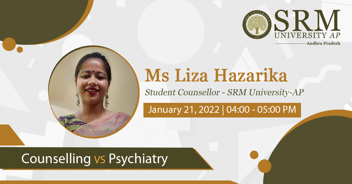 The Department of Student Affairs organises a session with Ms Liza Hazarika, Student Counsellor, SRM University-AP, on the difference between “Counselling VS Psychiatry” on January 21, 2022, at 04.00 pm.