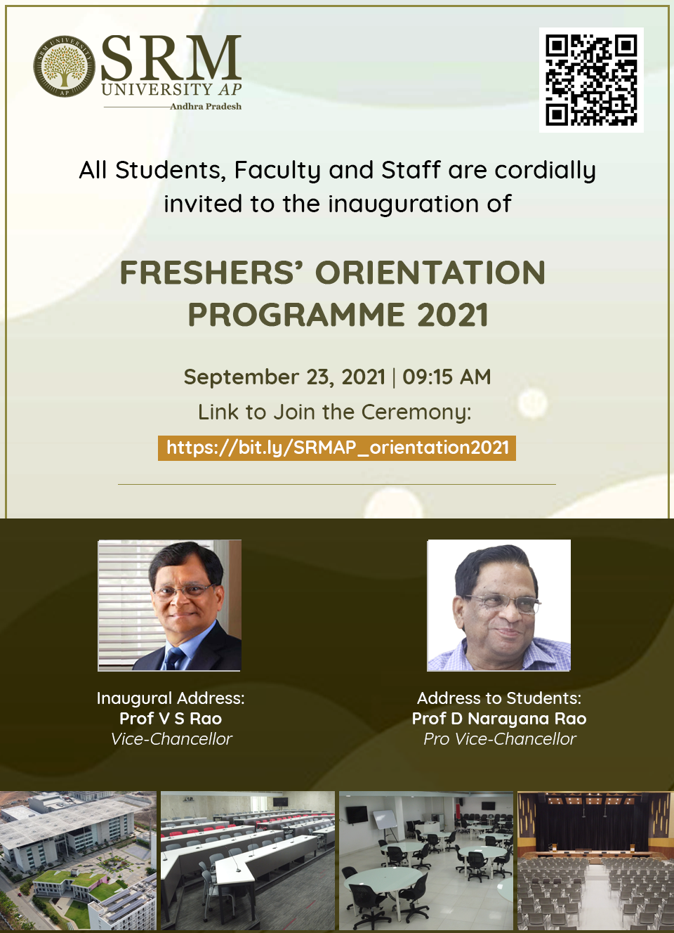 SRM University-AP organises the second session of Freshers’ Orientation 2021 from September 23 to 01 October 2021 to expose students to university life and to acclimate them to their new surroundings. The programme will be inaugurated by Vice-Chancellor Prof V S Rao on 23 September 2021 at 9.15 am. Following the inaugural address, Pro-Vice-Chancellor Prof D Narayana Rao will address the students welcoming them to the university as the newest members of the SRM community.