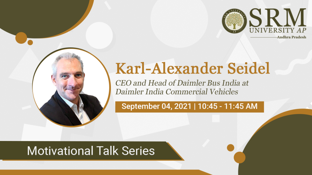 In the next chapter of Freshmen Orientation Programme-2021, a special talk will be delivered by renowned corporate mogul Mr Karl-Alexander Seidel. Mr Alex is the CEO and Head of Daimler Bus, India at Daimler India Commercial Vehicles. The talk has been scheduled for September 04, 2021, at 10.45 am and aims to provide an insight of the industry and its culture.